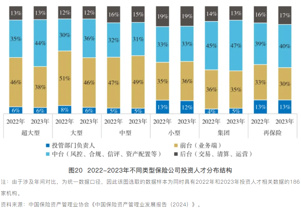 从投资人才分布结构来看,超大型人身险公司、保险集团中台人员比例更高,且超大型人身险公司的中台人员比例较去年上升9个百分点。大、中型保险公司前台人员比例更高。