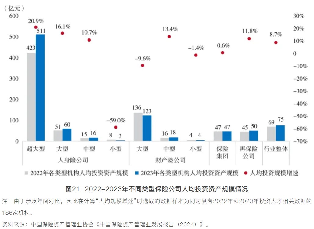 从2023年参与调研的194家保险公司口径看,2023年全行业人均投资资产规模为75.31亿元。从机构类型看,除小型人身险公司、大型财产险公司和小型财产险公司外,其他类型公司人均投资资产规模均有所增长,且增速较上一年度有所提升。从机构规模看,超大型机构人均投资资产规模涨势最为强劲。