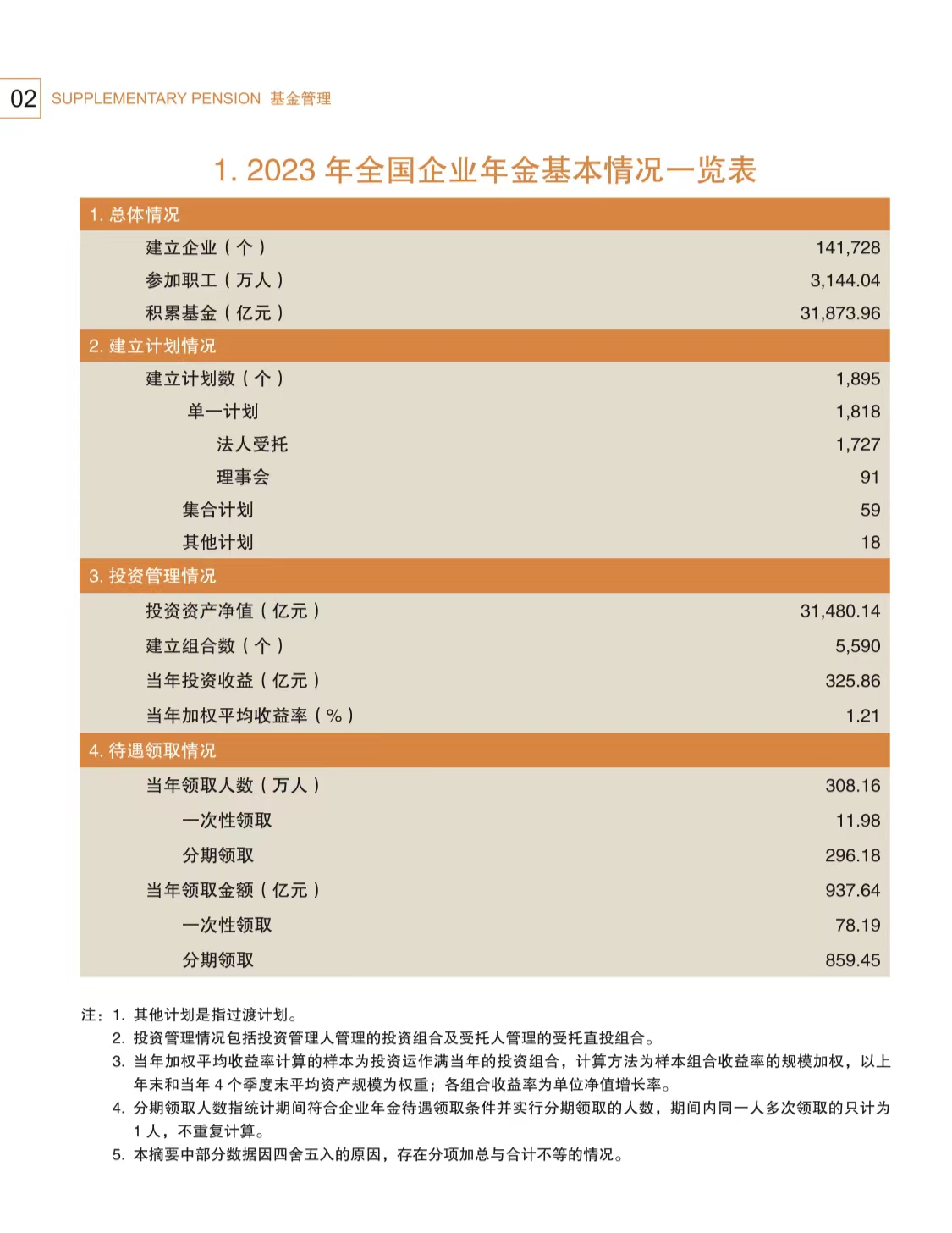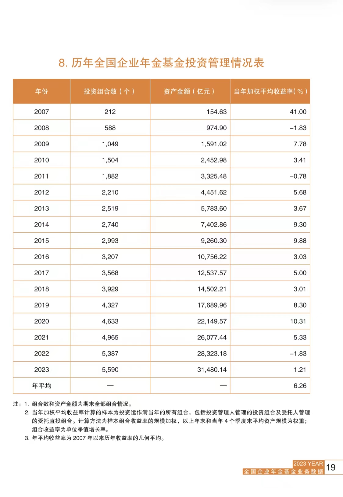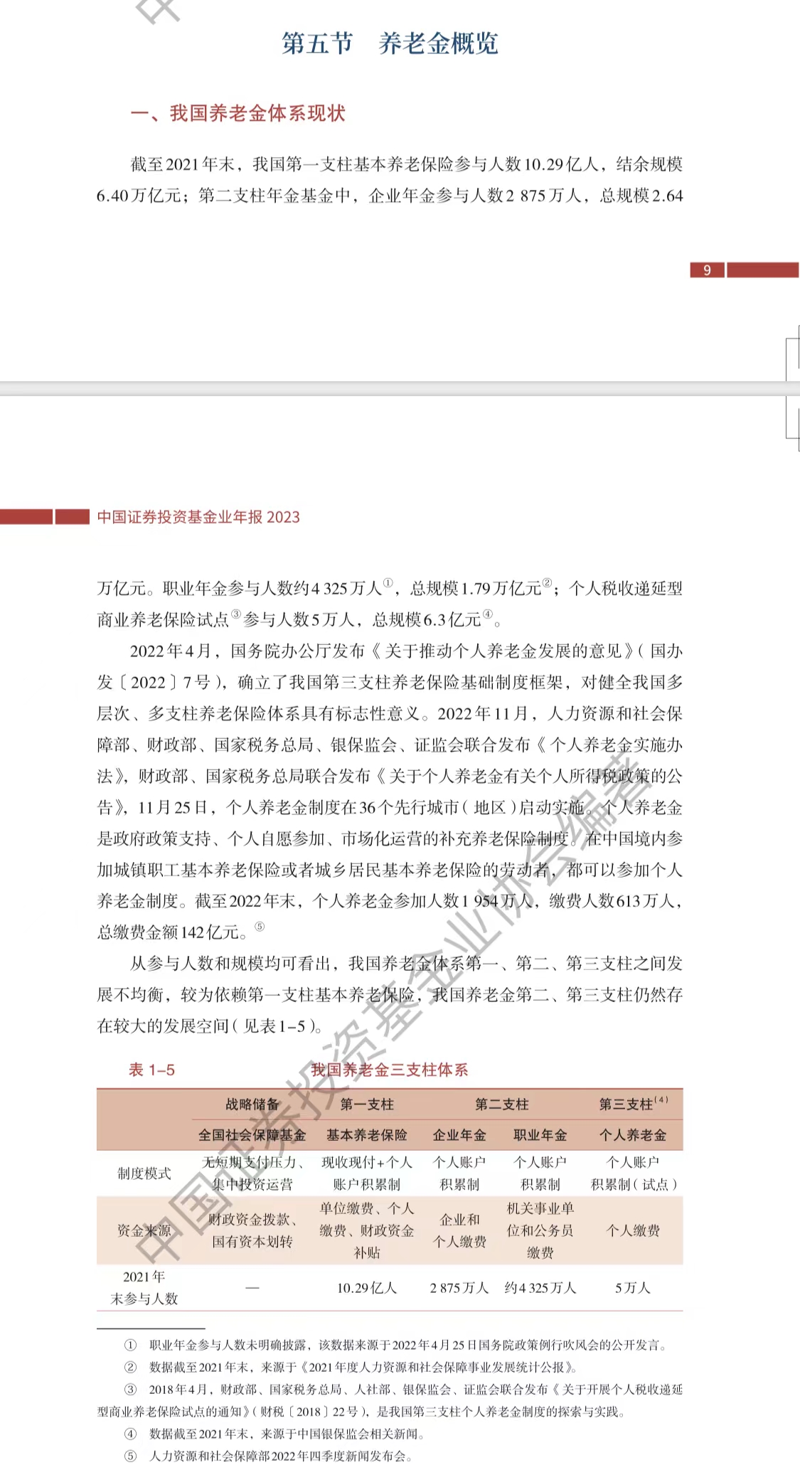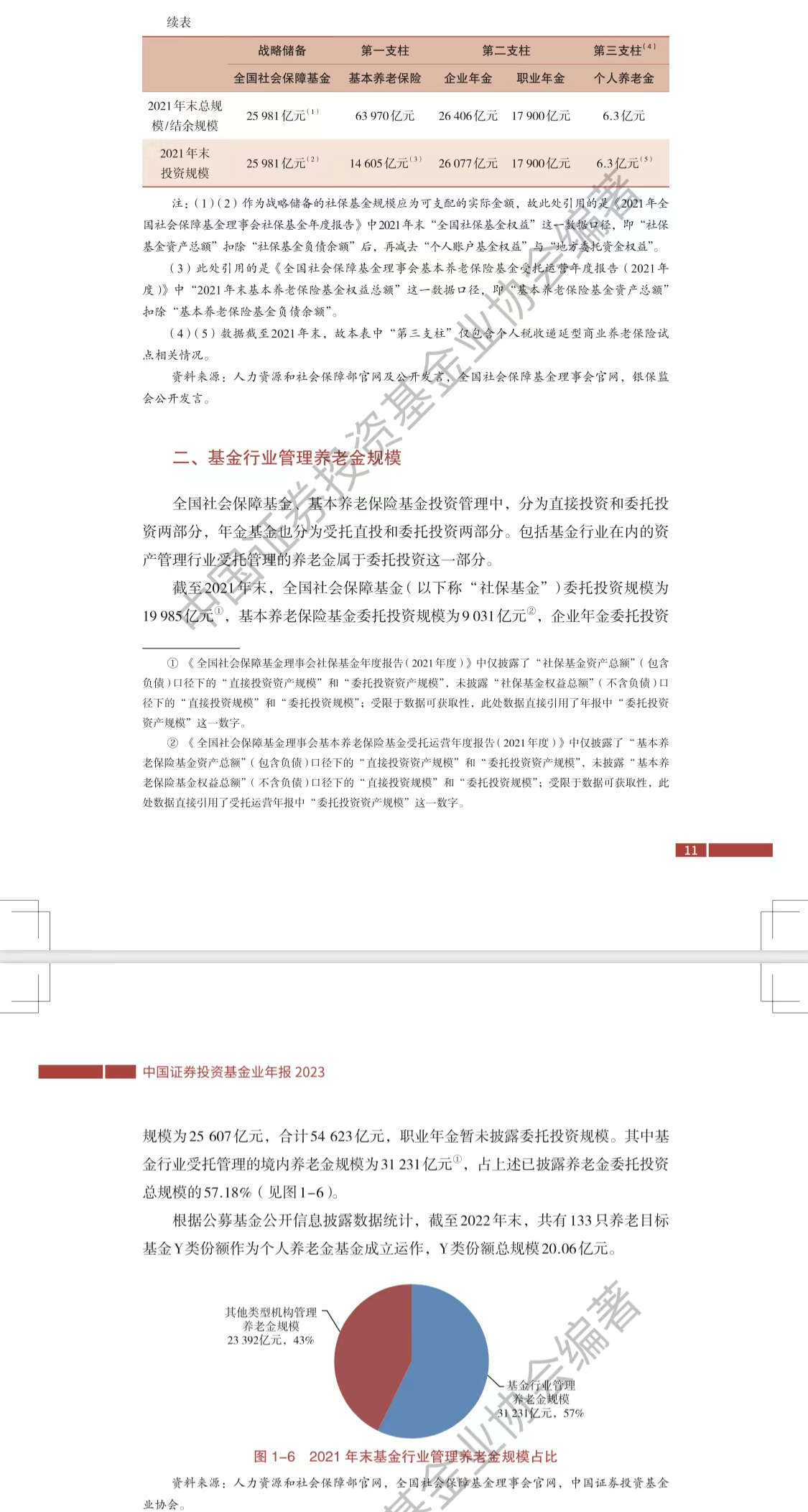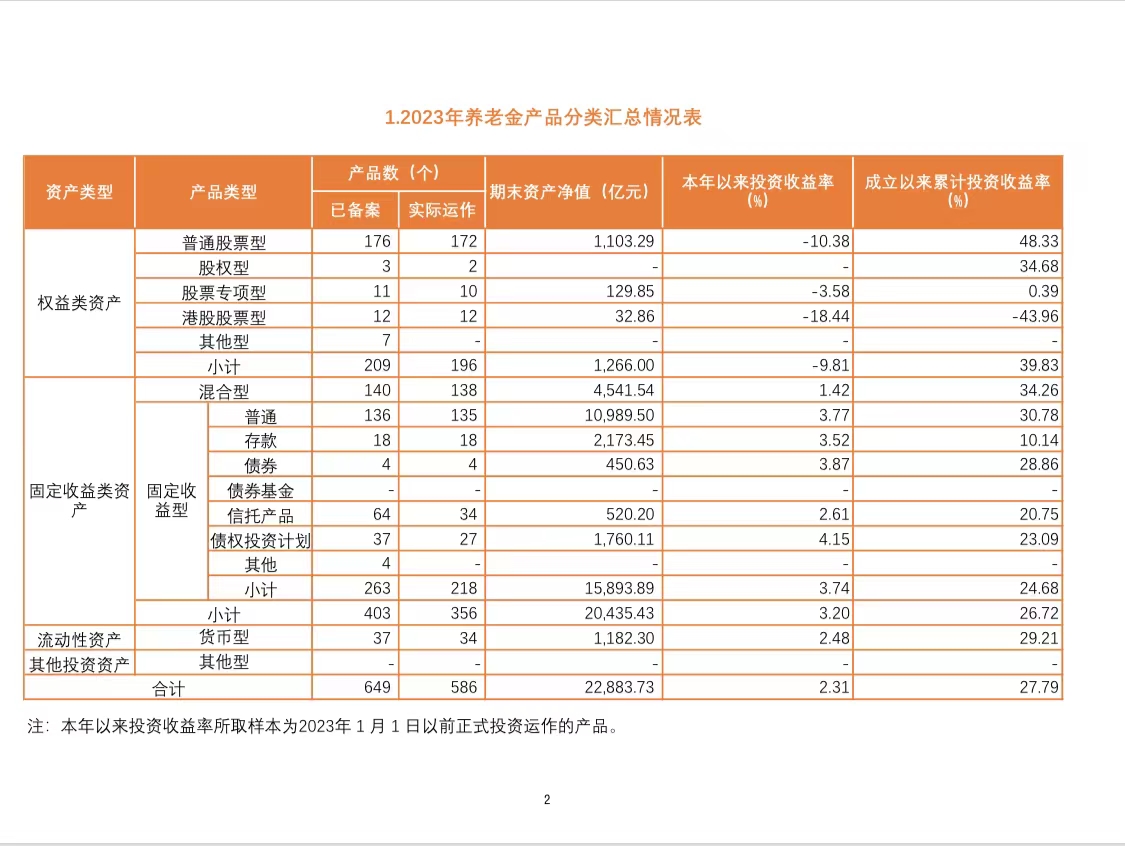 2023年末,养老金产品资产净值22883.73亿元,收益率2.31%,其中固定收益资产20435.43亿元,收益率3.20%;流动性资产1182.30亿元,收益率2.48%;权益类资产1266亿元,收益率-9.81%。