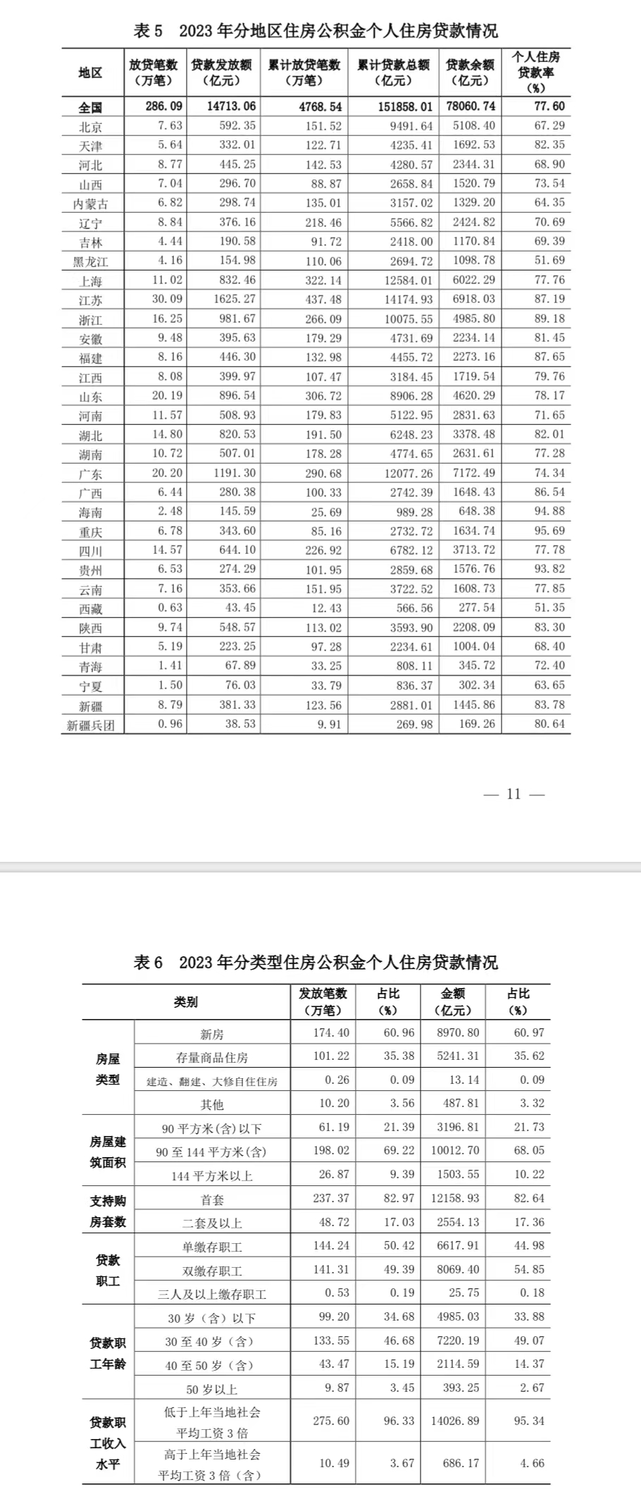 截至 2023 年末,累计发放住房公积金个人住房贷款4768.54万笔、151858.01亿元,分别比上年末增长6.38%和 10.73%;个人住房贷款余额 78060.74 亿元,比上年末增长6.96%;个人住房贷款率77.60%,比上年末减少1.34 个百分点。