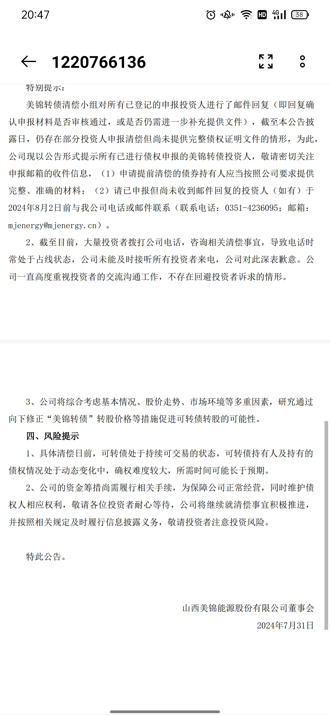 我也是美锦转债的清偿人,因为上次美锦清偿了,我于是这次也做了清偿,其他清偿债我大部分也做了,其他债基本都能获利出来,但我和美锦的电话沟通后,我做过其他问题债的经验告诉我,这公司已经做好一直拖延下去的方案,而我们就是那个代价,所以才叫大家赶紧打电话给美锦,告诉美锦我们准备去公司总部正常合法追讨我们的债权,公司承担得起这个影响吗,请美锦转债清偿人团结一下,如果只有几个人打电话,没多少力量的,希望美锦转债清偿人理解这次美锦转债清偿的危险。