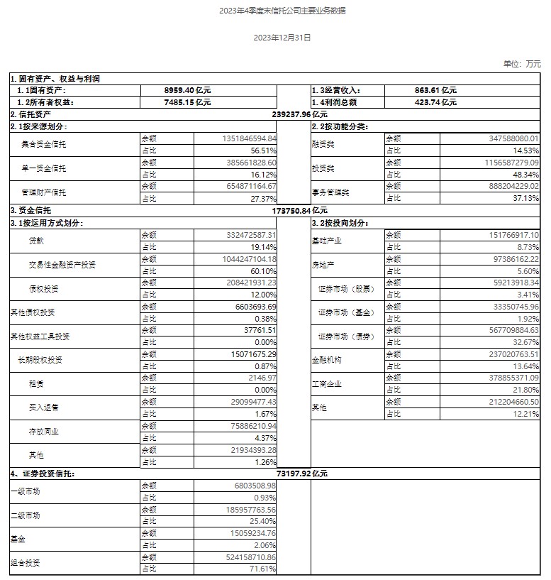 截止2023年4季度末,信托资产规模余额为23.92万亿元,较上年同期增加2.79万亿元,同比增幅为13.17%。