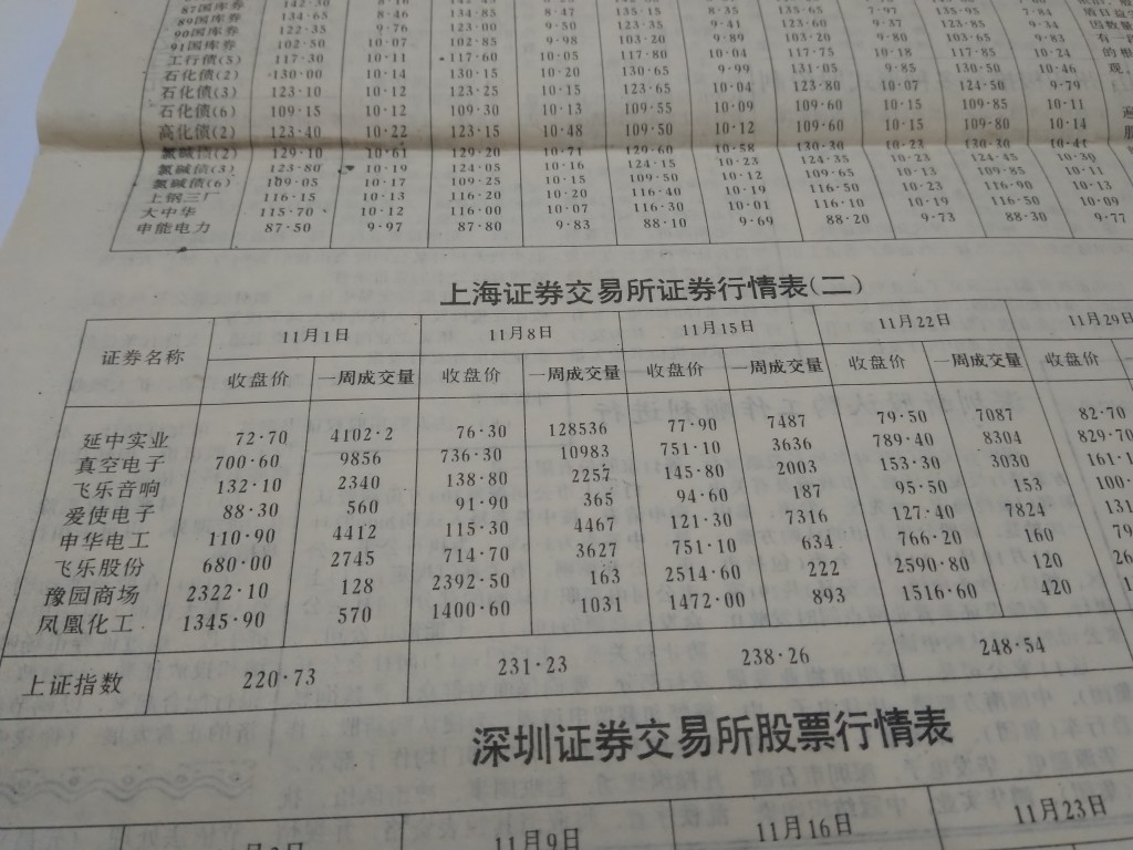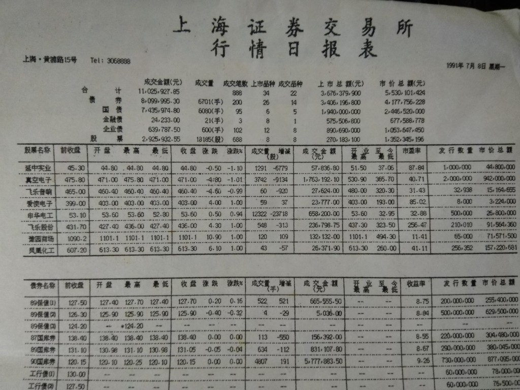 1991年7月8日的上海市股票行情。1991年11月上证指数220.73