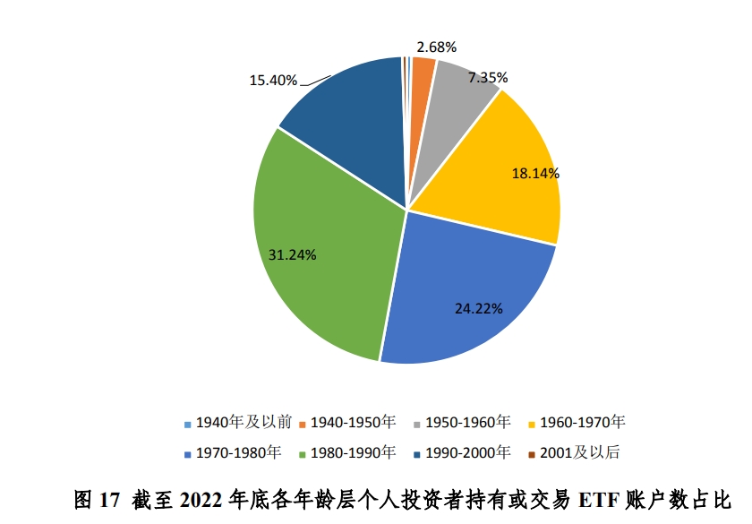 青年参与ETF投资的意愿较强。从持有数量来看,2022年持有或交易过沪市ETF份额的个人投资者中,出生年份在1980-2000年的投资者占比最高,约 46.64%。出生年份在1960-1980的中年个人投资者在持有或交易过沪市ETF的个人投资者中占比42.36%。