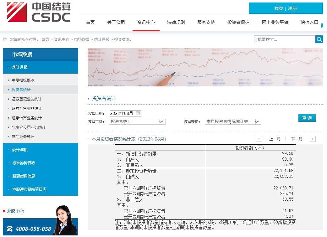 中国证券登记结算有限责任公司《本月投资者情况统计表》更新到2023年8月,已开立A股账户自然人投资者22030.71万人。2023年8月当月新增自然人投资者数量99.30万人。2023年1-8月新增自然人投资者数量925.29万人。
