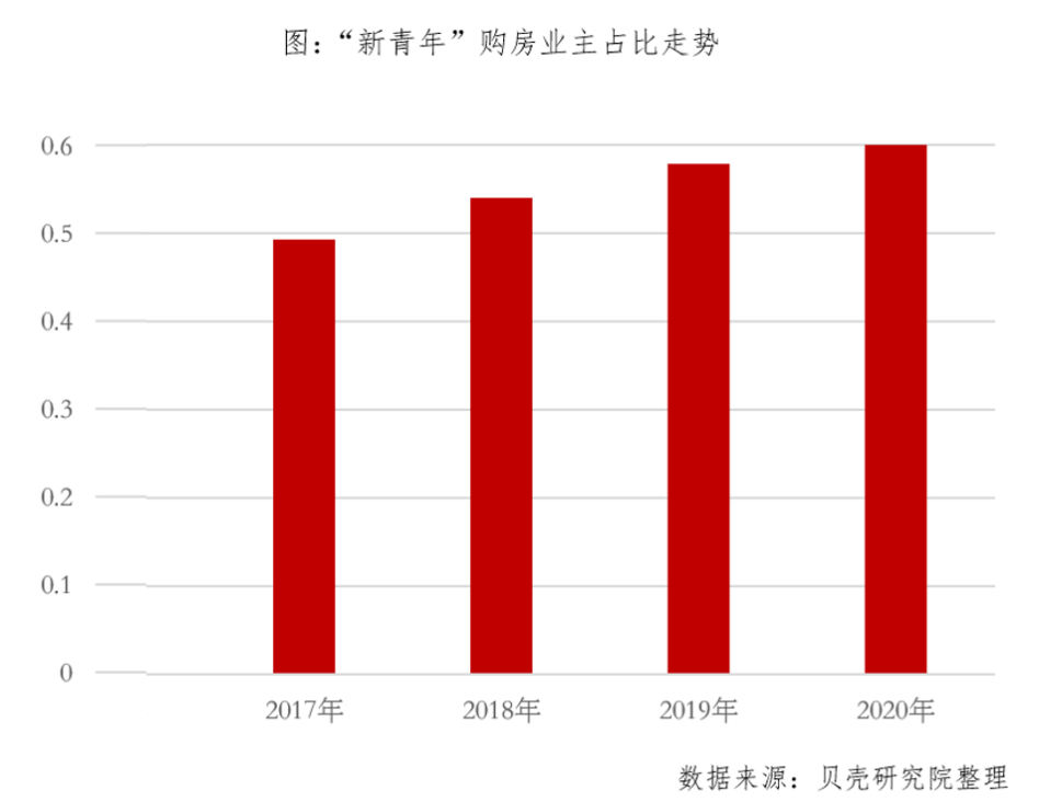 据《2021居住客群消费趋势年报》研究显示,由于新青年(31-36岁)正处于“成家立业”的年龄段,这一人群的置业占比呈现持续走高的态势。以贝壳为例,2020年,新青年置业占比已经高达60%。