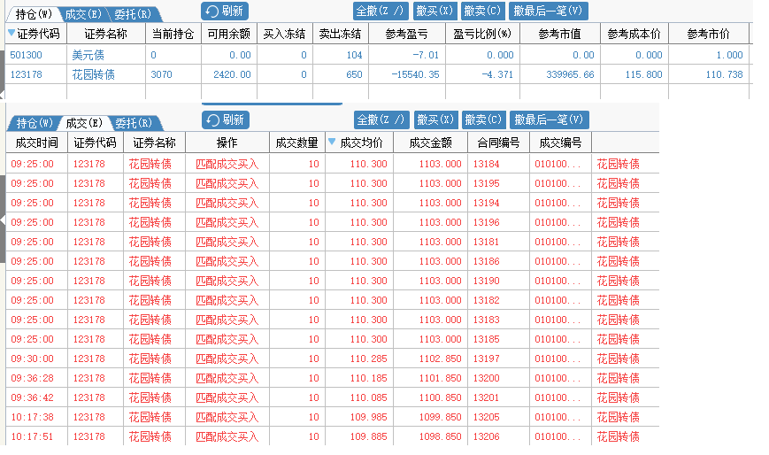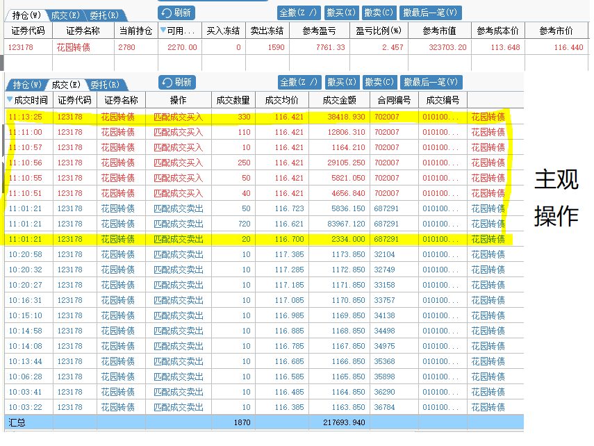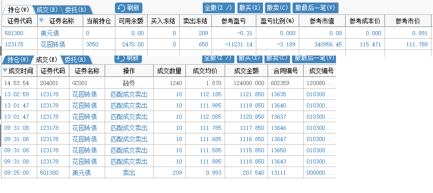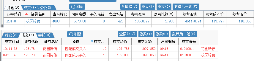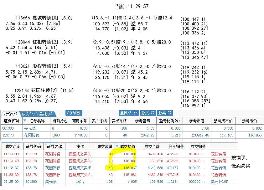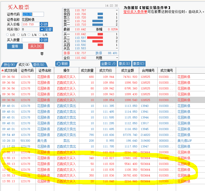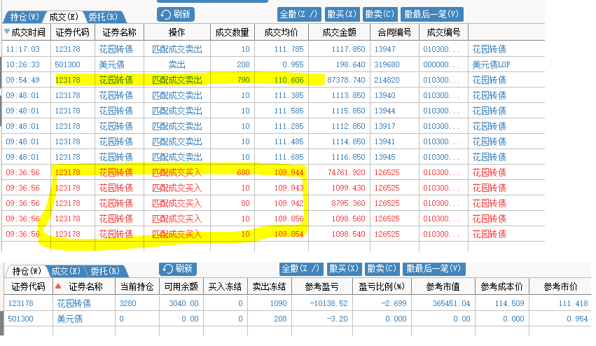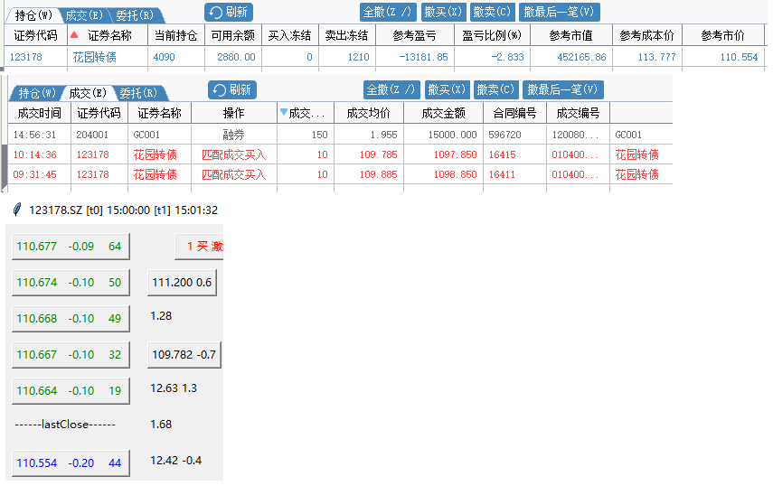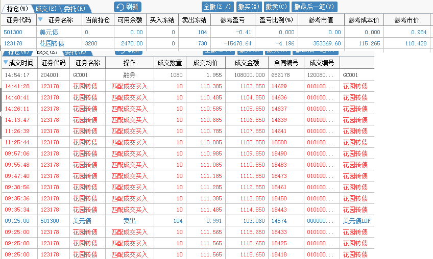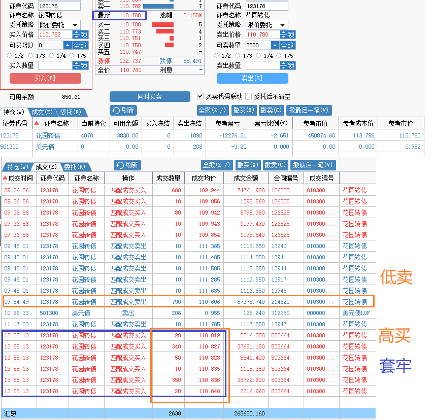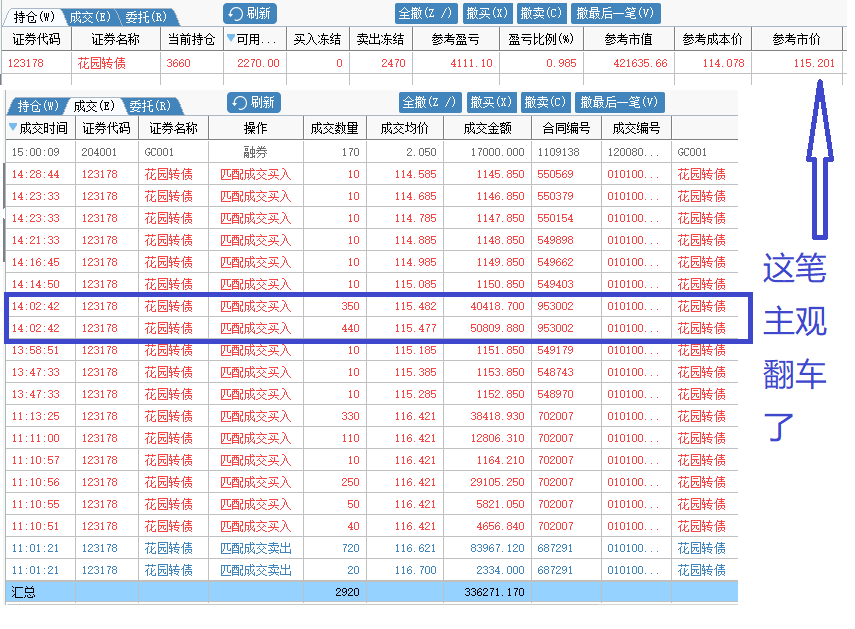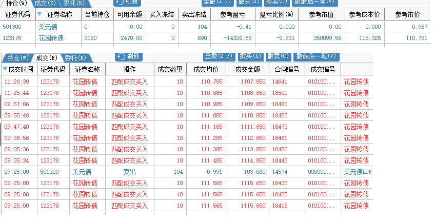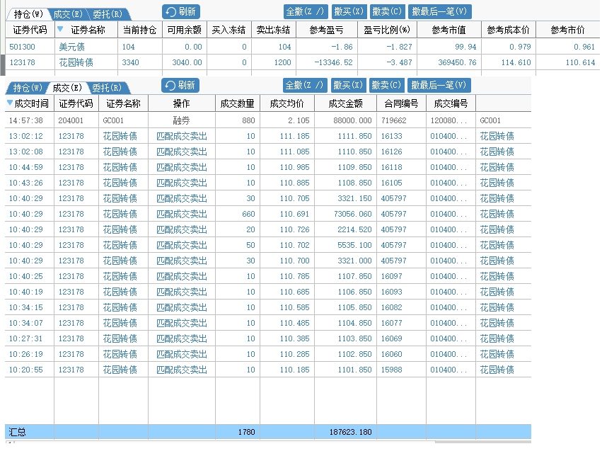 不过另一面也是指数、股民,债民不给力,而我设置的条件单又高了一点,用115.46与108.2的中值111.83,这比今天上午的最高价和还高0.33,最终眼看着巨幅回落,最终看着要破110.2无奈含泪割肉,然后进进出出,反反复复,心惊胆颤