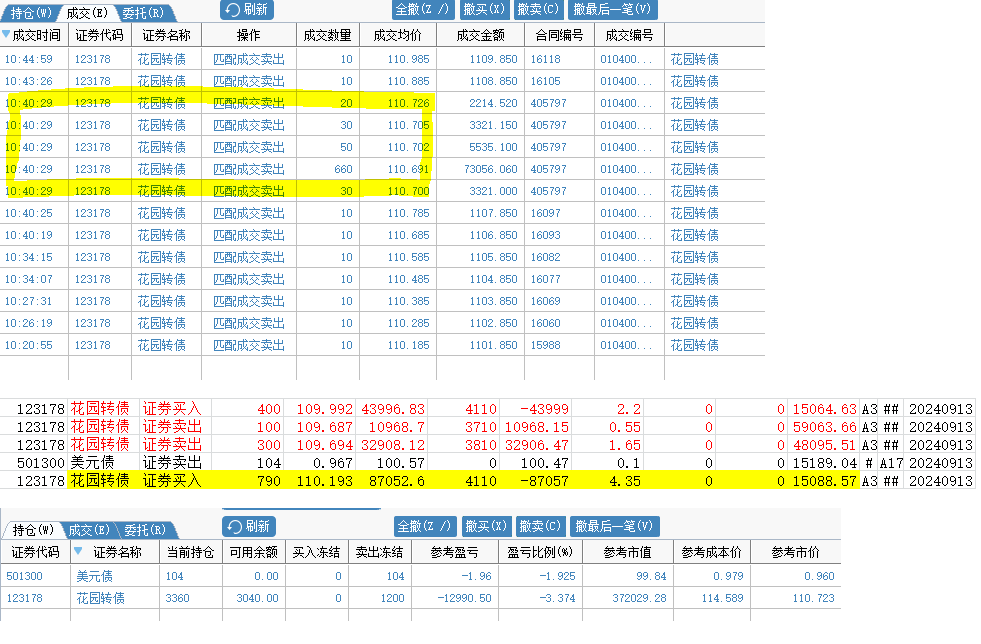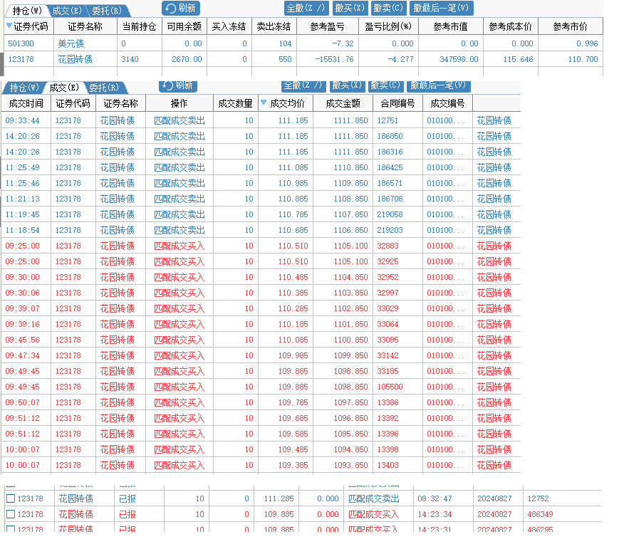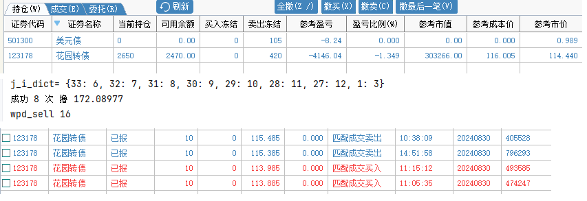另外,跌倒110.2附近恢复了 网格买卖,卖出了2笔,其实可以卖3笔,只是不小心撤单了【如果不停网格,存被动操作,大概能卖出14笔,买回6笔】,一波主观加仓,停止网格,再减仓,最终的结果,相对 2024-09-11 午盘 持仓3440张 成本 114.852 变为 当前的 持仓 3420 成本114.755