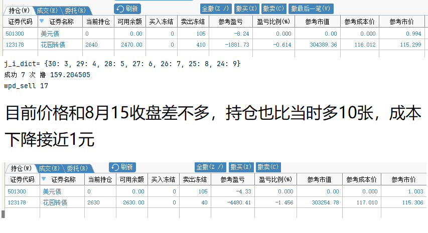 因为一开始不信发生9%的概率,没想到真发生了,导致790张少卖了7毛钱,当然债强,股弱这是没想到的,虽然明天又会套上,但今天是8月9日以来,第一天收盘解套