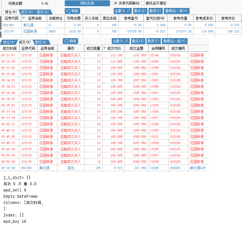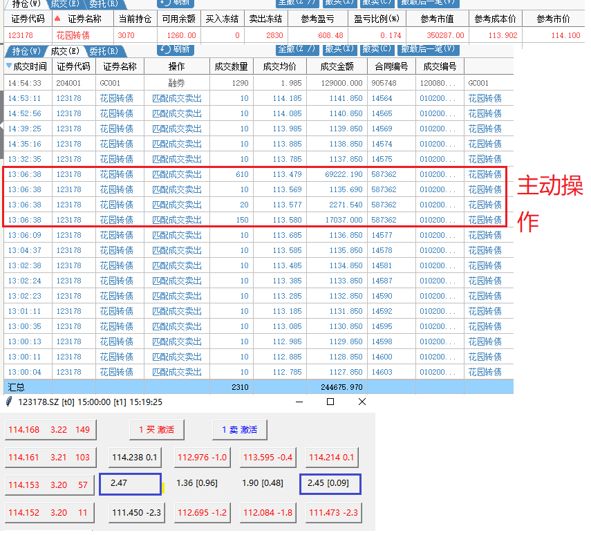 主动买卖太难受了,担惊受怕,一上午预估400,但按照软件成本的降低幅度113.947到113.862,实际差价就357元,这~~~~千分之一的收益都还没有,要知道如果被动卖出,今天因该是卖出14笔,买入6笔,单纯卖出的部分,也会有238元,就算只看差价也有102左右,关键是心态平和啊,顿时觉得人间不值得
