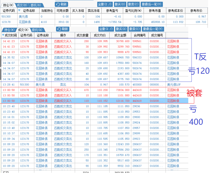 下午介入被套,多亏了400,另外T反亏了120,没有随着上证去跌到109.4XX这个有点出意外,因为T反,所以成本反而被整高了,悲剧啊