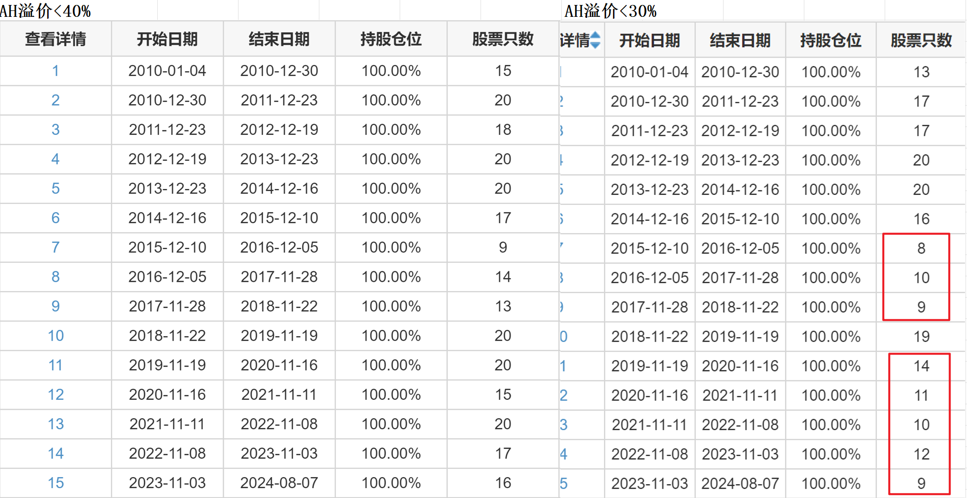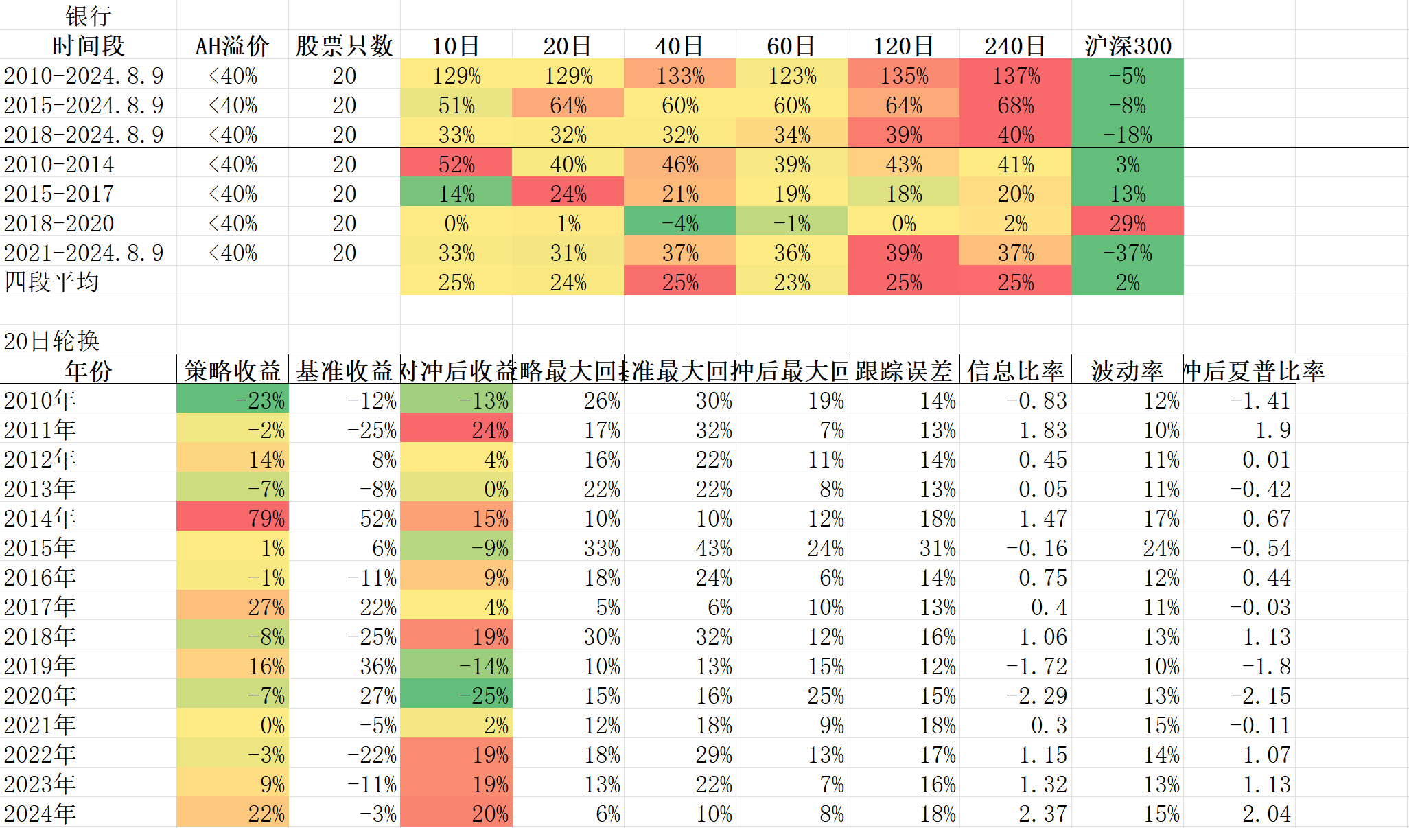条件1:AH溢价率低于40%,行业按申万2021,每20交易日换一次,不超过20只,等权配置。