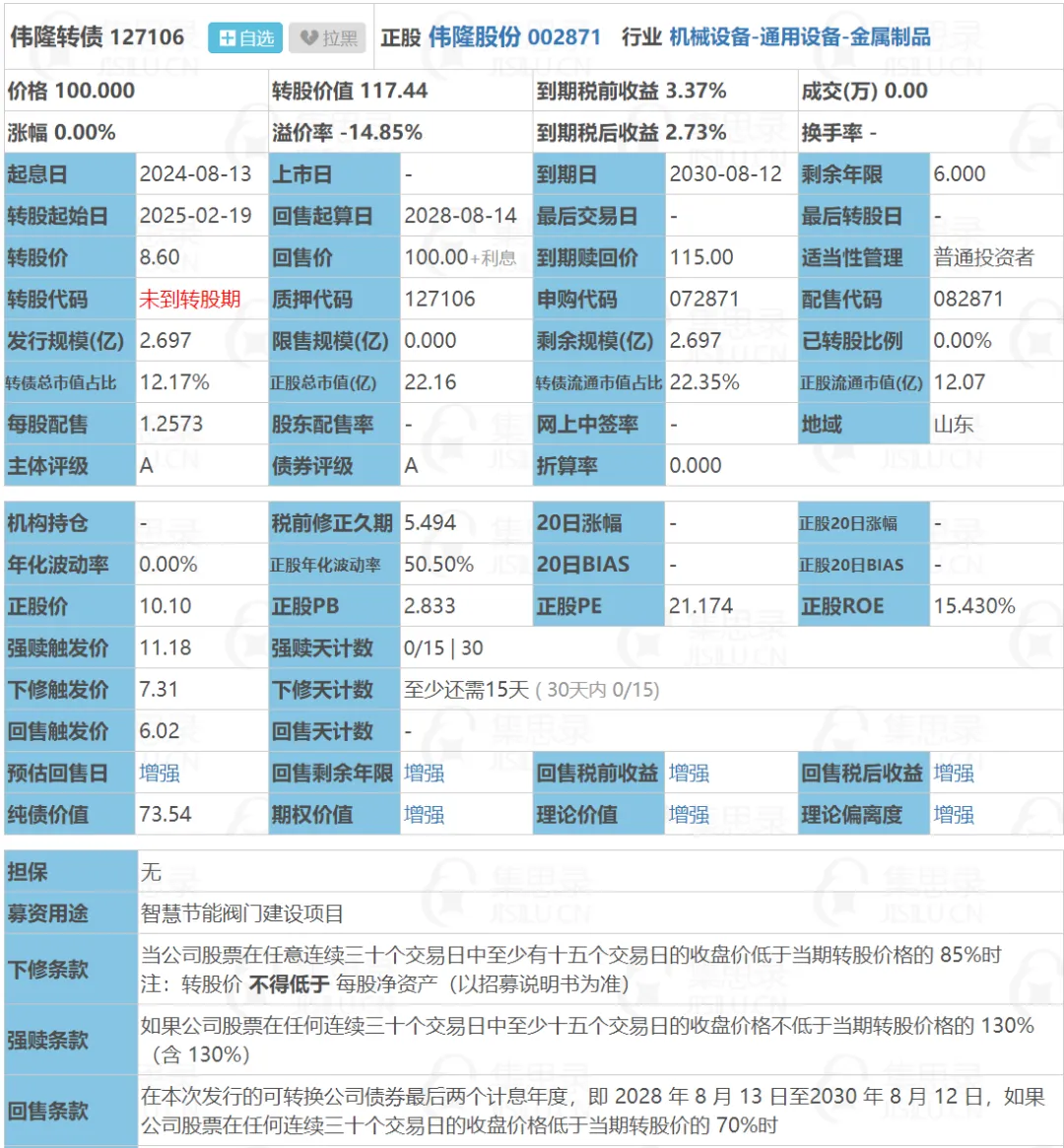 伟隆转债:(正股代码:002871,配债代码:082871)