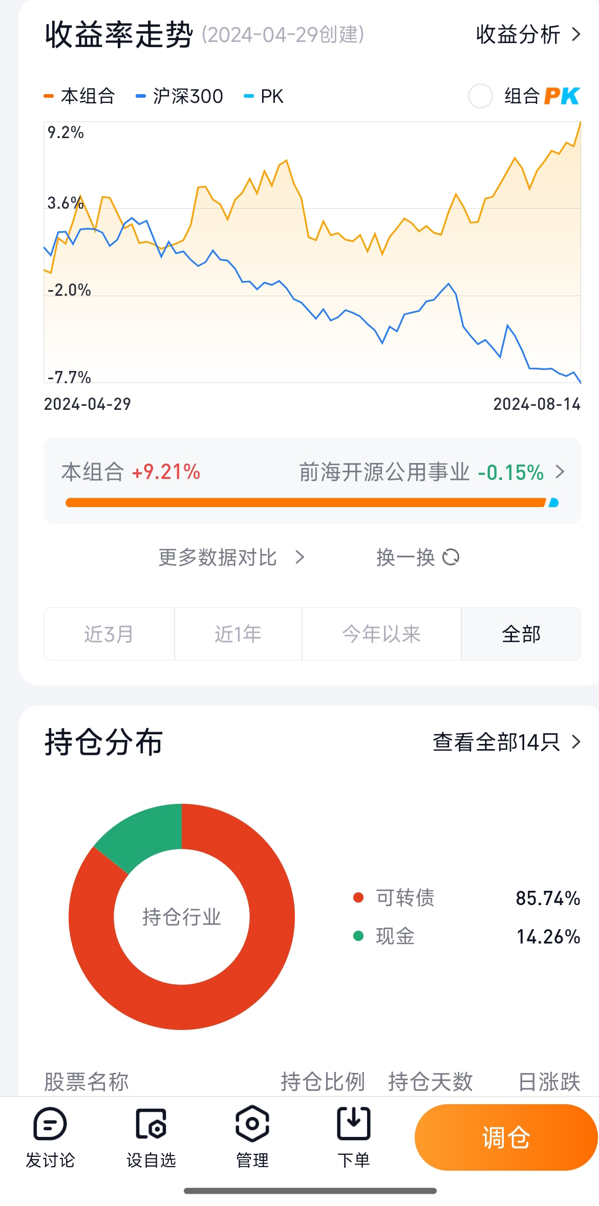 现在这位置就不清仓了,如果能涨回来出来以后会减少可转债的仓位。