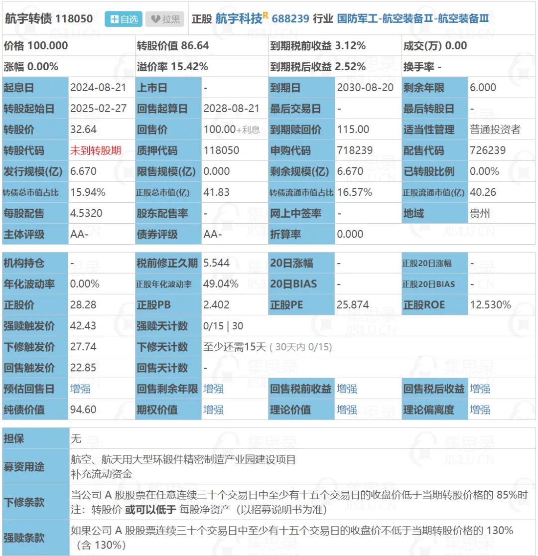 航宇转债:(正股代码:688239,配债代码:726239)