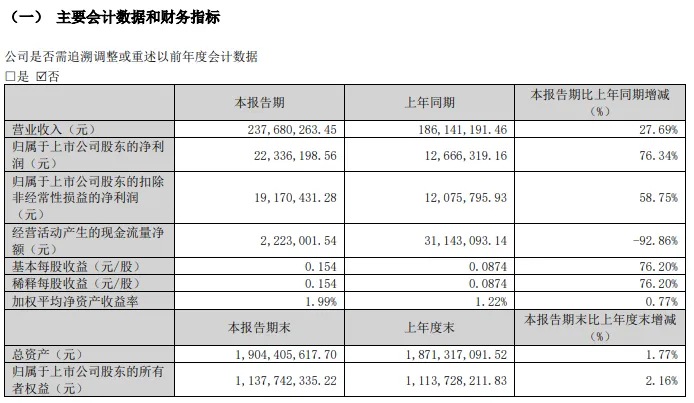 2024年第一季度公司实现营业收入同步增长27.69%,归属上市公司股东的净利润同比增长76.34%。