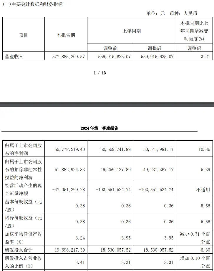 2024年第一季度公司实现营业收入同比增长3.21%,归属上市公司股东的净利润同比增长5.39%。