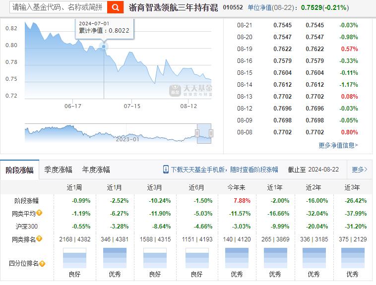 浙商智选领航三年持有期混合A,净值0.7529,三年多亏损25%,我本以为是只烂基,没想到在基金排名中居然是优秀。