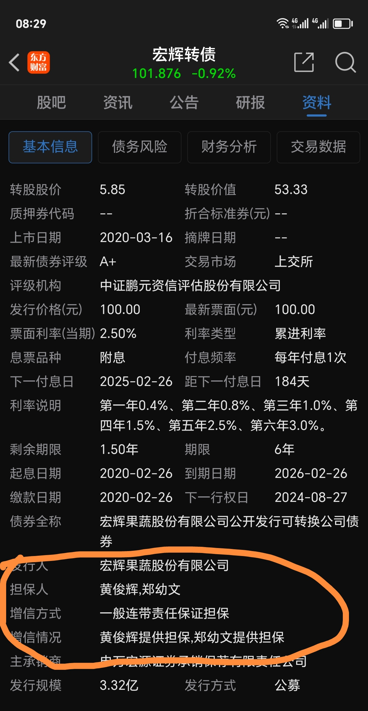 看不惯那些只要收益不允许有风险的,动不动就逃废债。试问一下宏辉转债没有瑕疵距到期1.5年收益率8%+目前这个价你能买到?好歹公司基本年年盈利,负债比率不到38%,而且转债由公司实际控制人担保,剩余规模也就2.247亿。这就是什么底气。