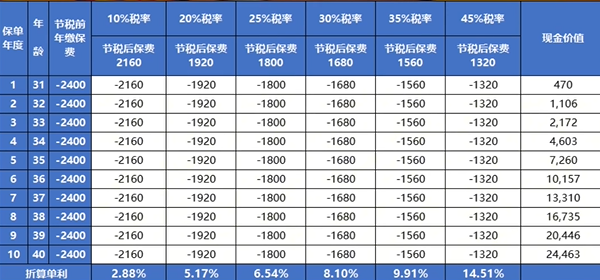 每年可以抵个税2400/年 按照10%抵税来看, 每年节省240元.