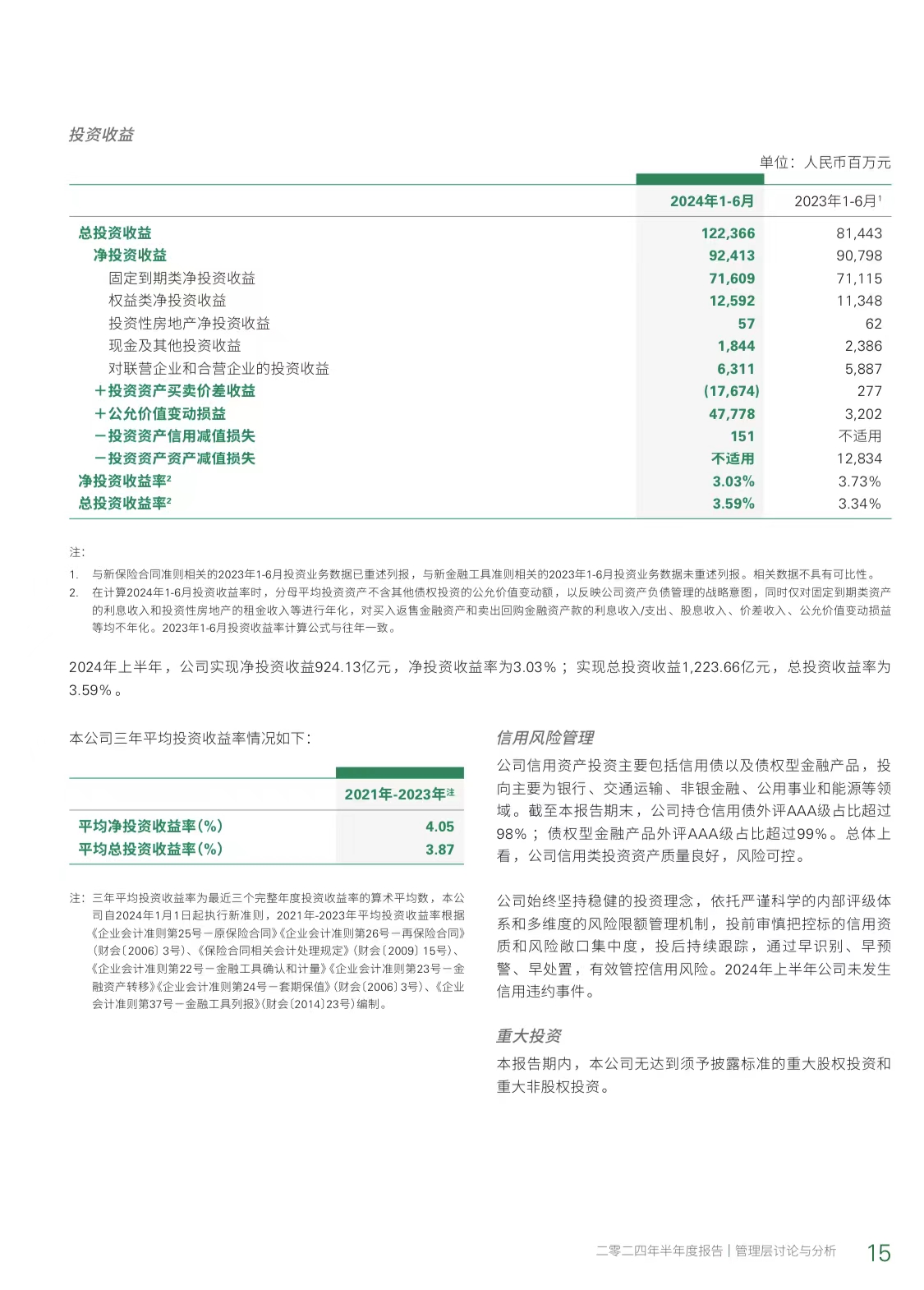 2024年6月末,中国人寿保险资金投资组合中股票4417.39亿元,占比 7.26%,较上年末减少0.69个百分点;基金2736.67亿元,占比 4.50%,较上年末增加0.68个百分点。基金含权益型基金、债券型基金和货币市场基金等,其中货币市场基金截至2024年6月末为10.73亿元。保险资金投资组合净投资收益率为3.03%,同比下降0.7个百分点。