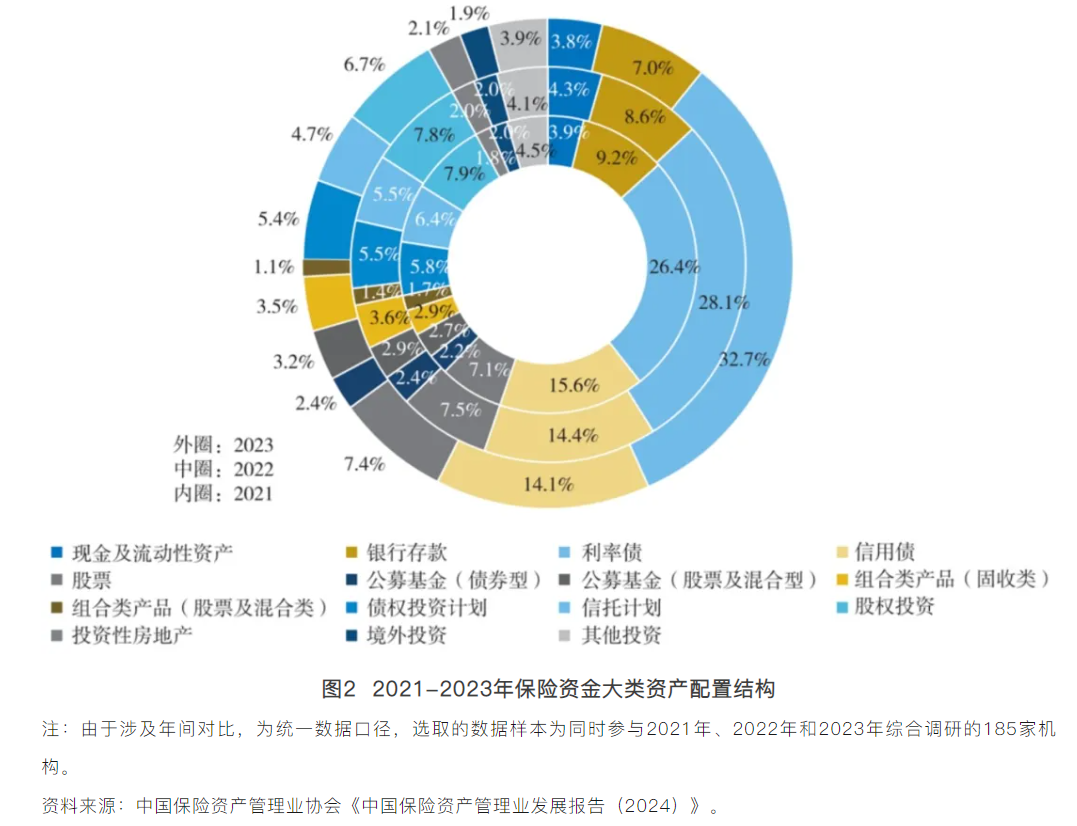 2023年,除银行存款、股权投资、信托计划、组合类产品(股票及混合类)和现金及流动性资产规模下降,其余各类主要资产的投资规模均有不同程度的增长。其中,投资规模增速前三的资产为利率债(28.45%)、公募基金(股票及混合型)(21.62%)、投资性房地产(20.50%);投资规模下降较快的资产为组合类产品(股票及混合类)、银行存款、信托计划、股权投资,投资规模分别下降11.14%、10.26%、5.43%、5.03%。