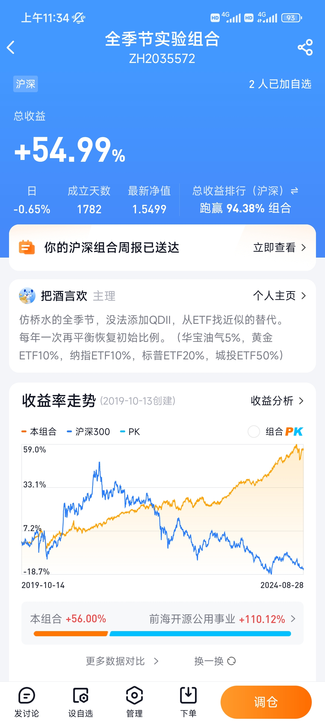 还有一个比较直接的优点,它是实现相对于沪深300的超额收益的。成立以来,大概超额了50%。也就是和挺多基民相比,经过这几年,他的跟随者收益领先了50%。