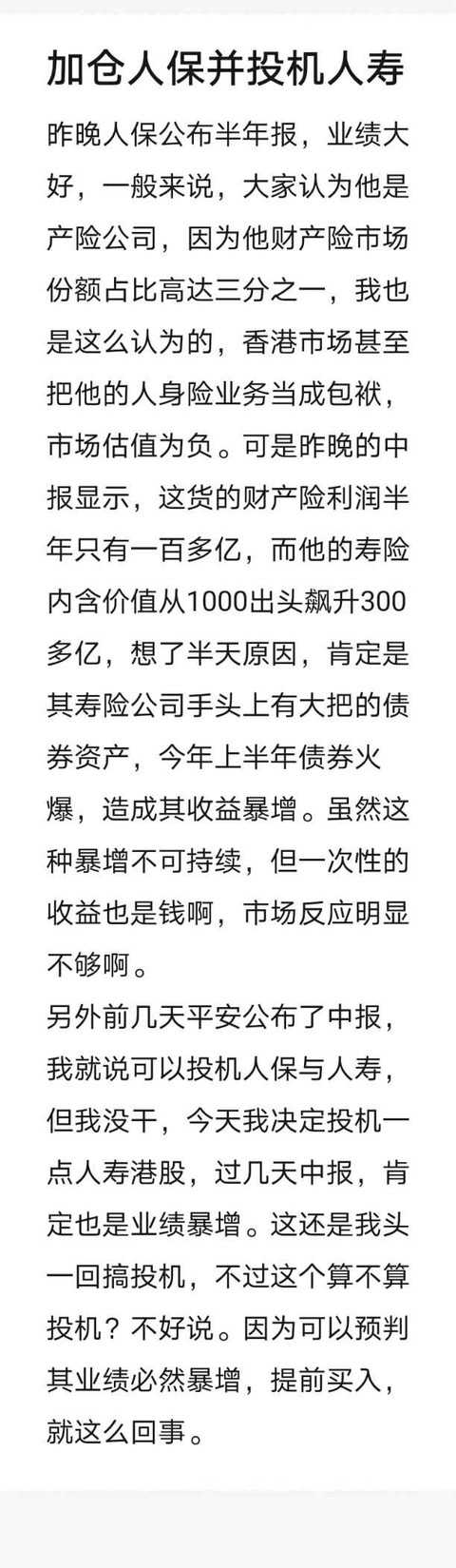 投机成功,昨晚人寿半年报,收益大增,内含价值半年增加300多亿,哈哈哈哈