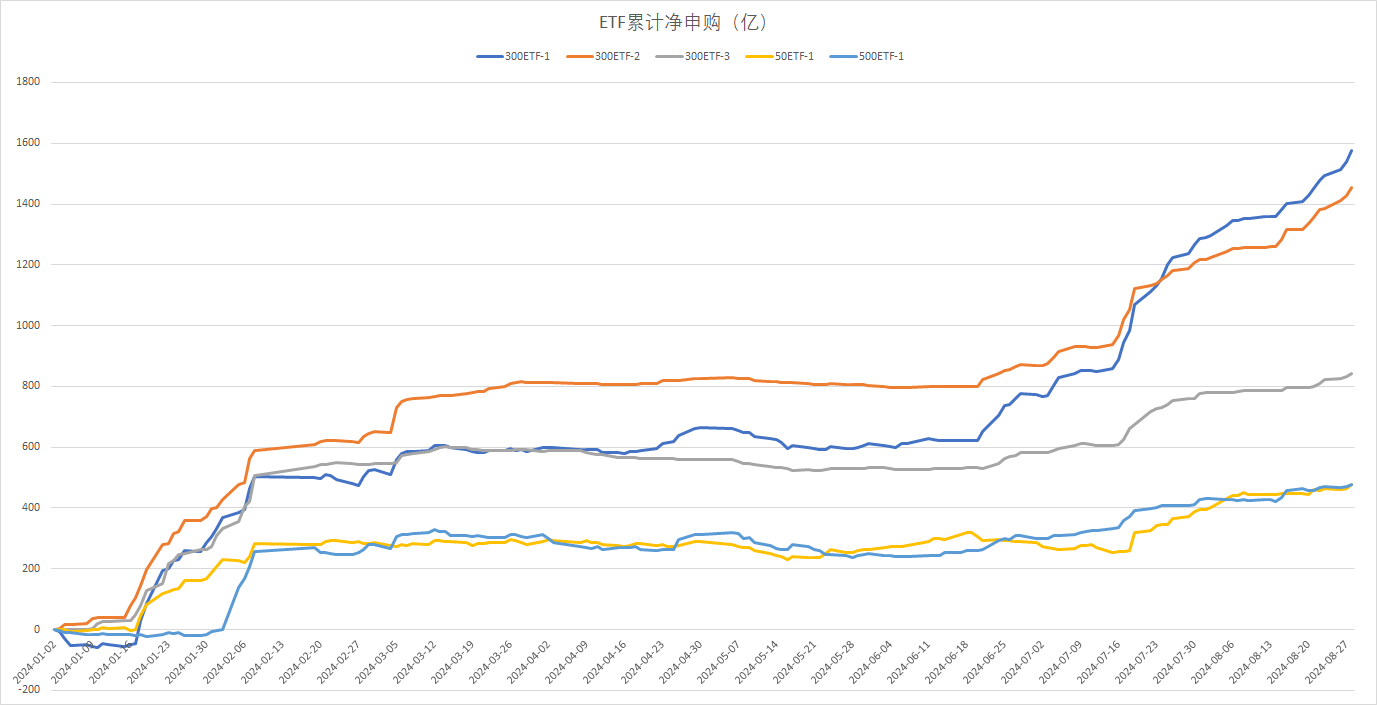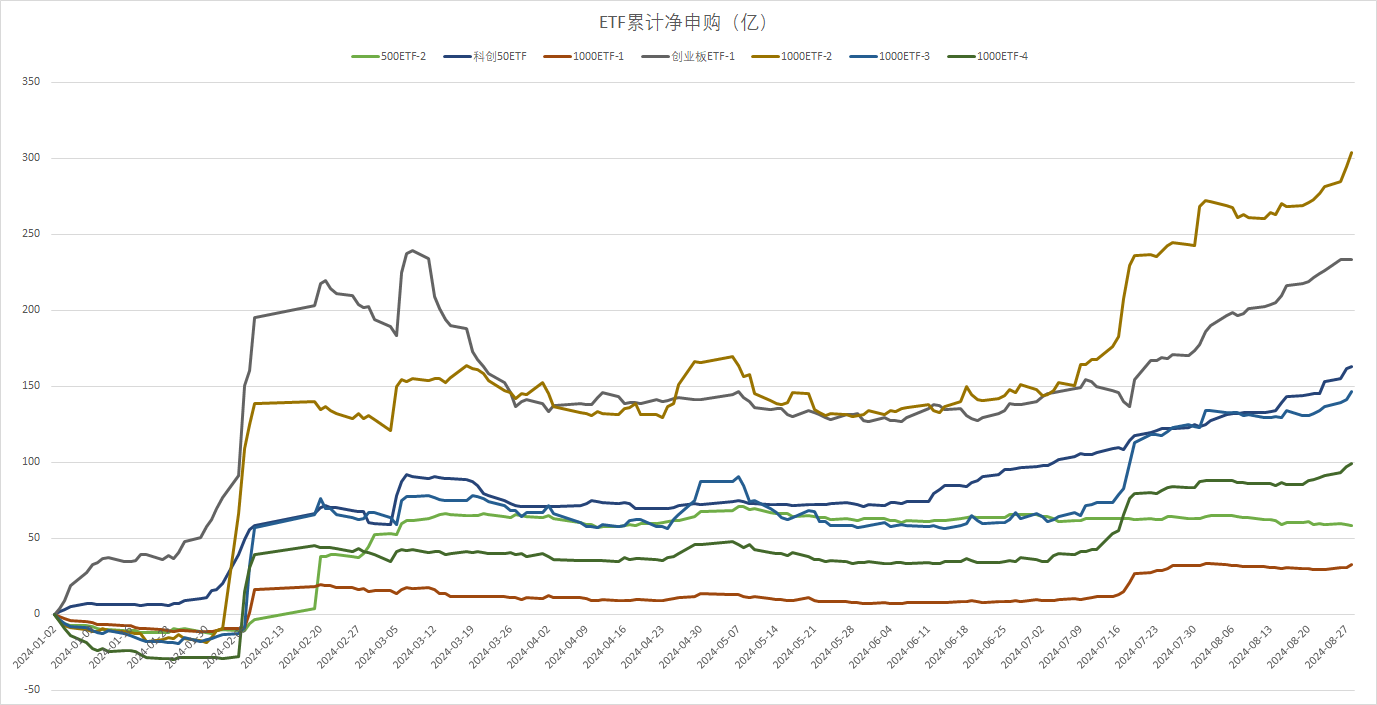 按照指数拆分,300ETF是绝对主力,累计净申购接近4000亿,占比2/3,其他指数比较平均。
