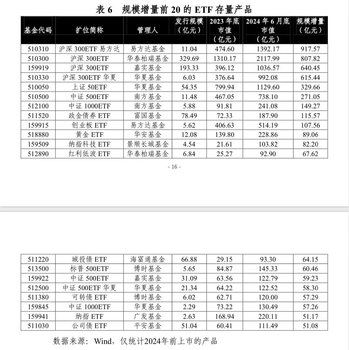 存量产品方面,沪深300、上证50、中证500、中证1000等宽基旗舰 ETF 规模大幅增长,其中易方达、华泰柏瑞沪深300ETF 规模增量位居第一、第二,分别为917.57亿元和807.82亿元。