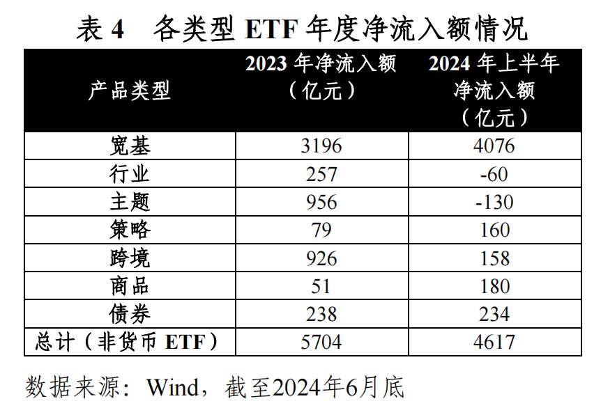 2024年以来境内ETF市场资金持续净流入。2024年上半年非货币 ETF 净流入额高达4617亿元,约占2023年全年净流入额的八成。分类型来看,宽基ETF净流入最高,达4076亿元,约为2023年宽基ETF净流入额的1.3倍。除此之外,策略 ETF(主要为红利ETF)净流入160亿元,商品ETF 净流入180亿元,债券ETF净流入234亿元。