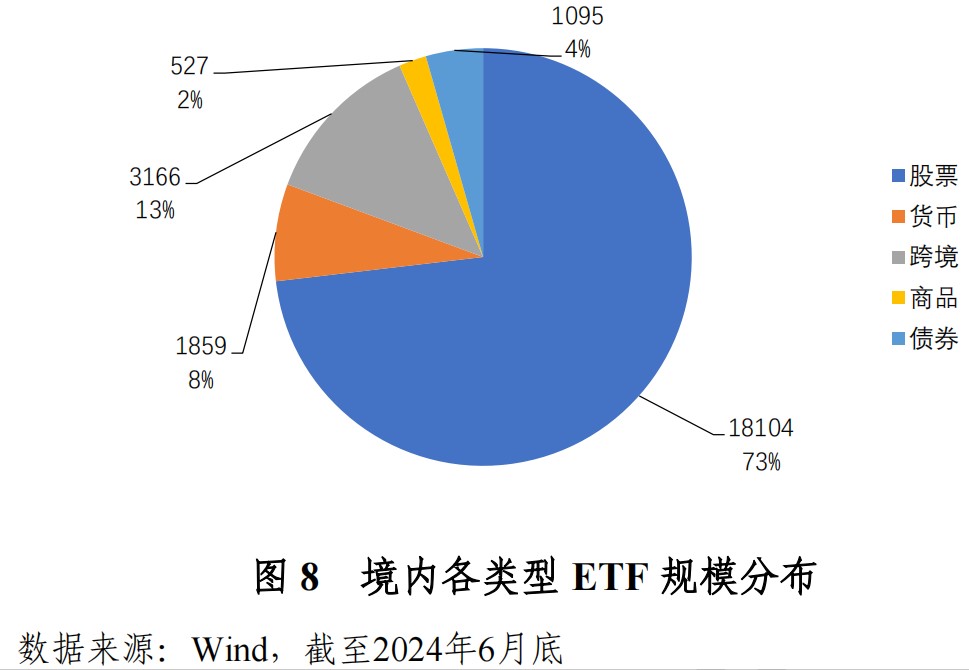 截至 2024年6月底,境内ETF 的投资标的涵盖了股票、债券、货币、商品、境外股票等大类资产,产品布局日益完善。其中股票 ETF 规模1.81万亿元,占比 73%;跨境ETF规模3166亿元,占比13%;货币ETF规模1859亿元,占比8%;债券ETF规模1095亿元,占比 4%;商品 ETF 规模 527亿元,占比 2%。