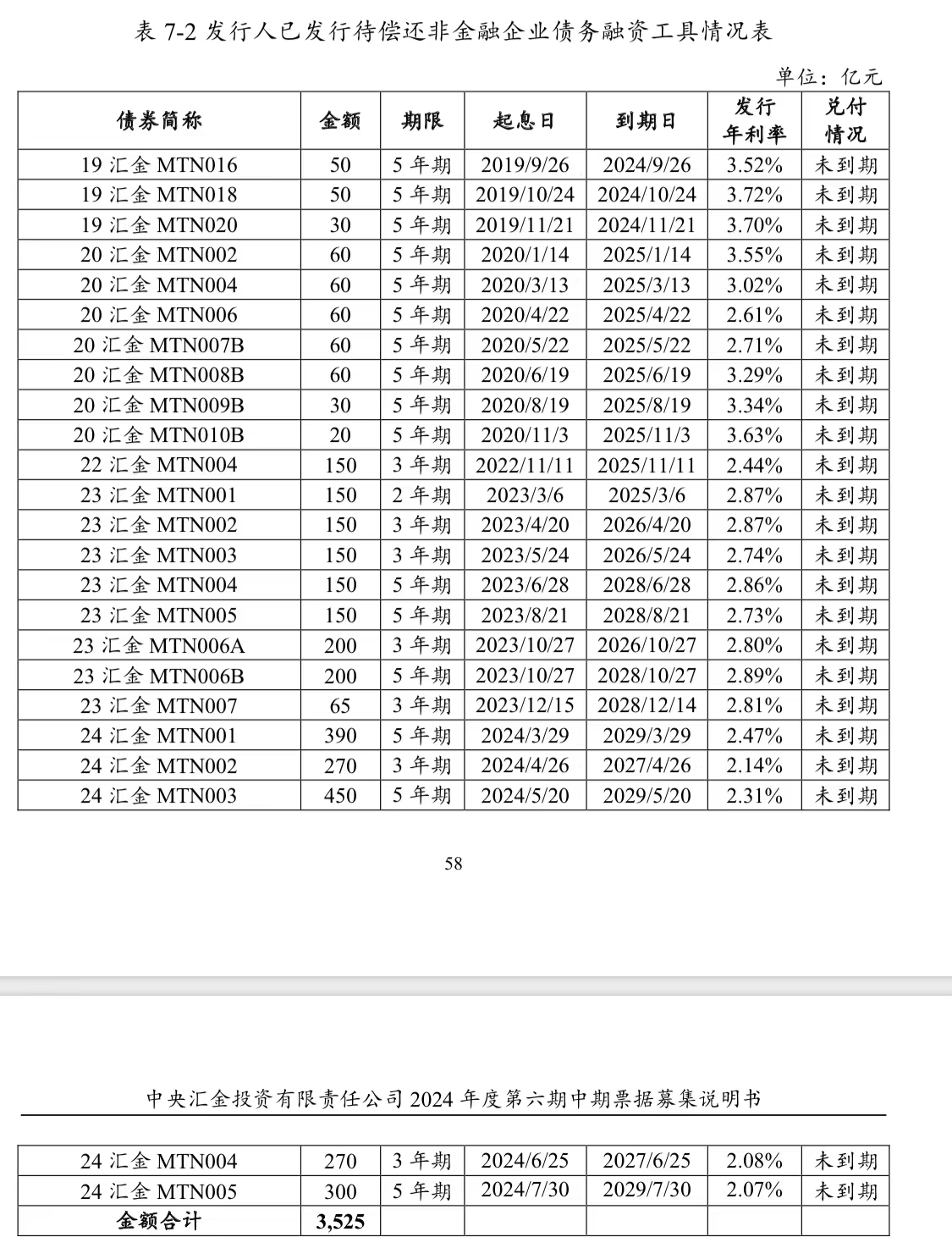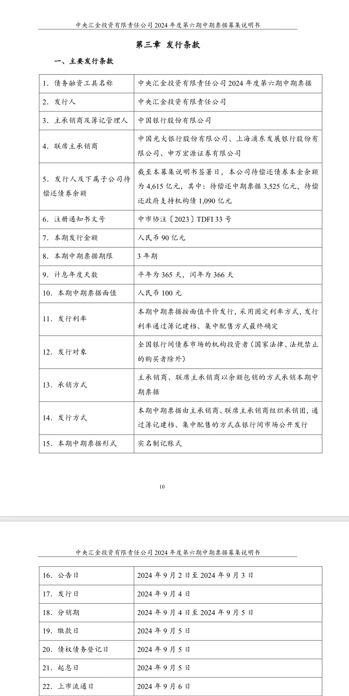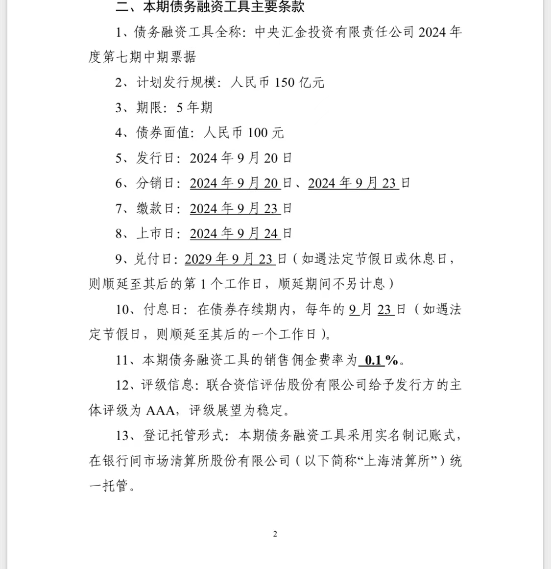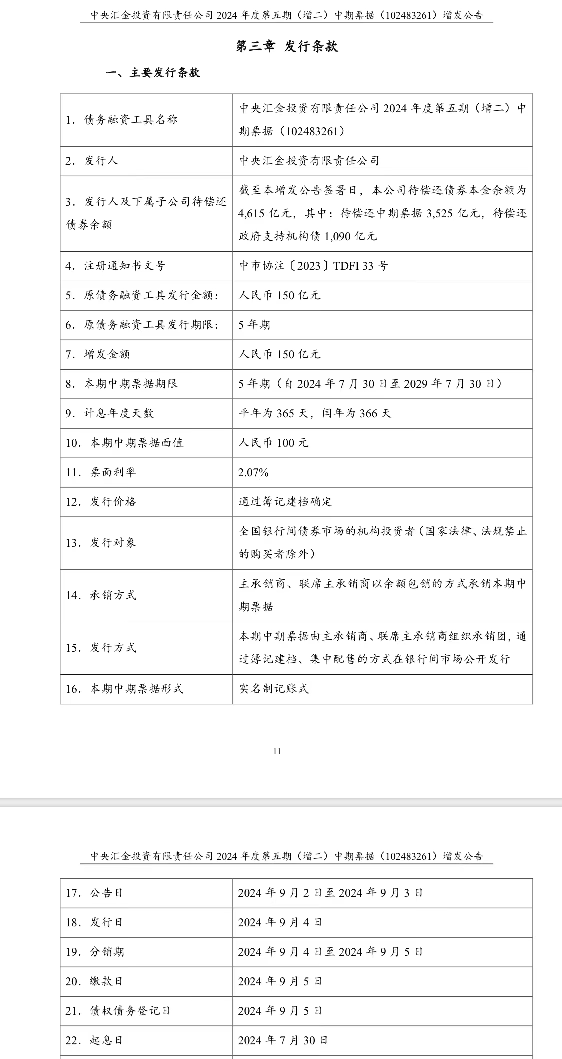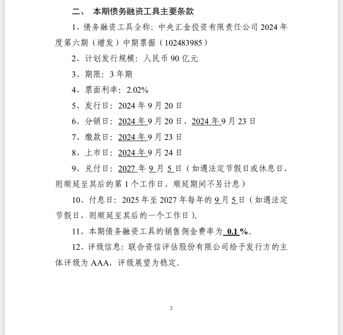 2024年9月4日,中央汇金发行2024年度第六期中期票据,规模90亿元,期限3年;同时发行2024年度第五期(增二)中期票据,规模150亿元,期限5年。今年累计发行1920亿元。130亿元中期票据将于9-11月到期。