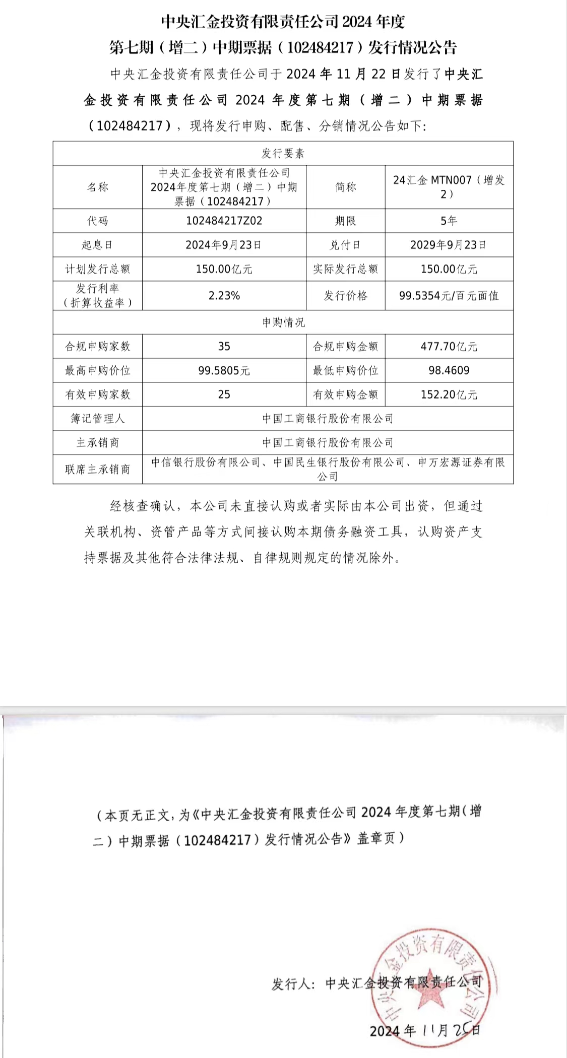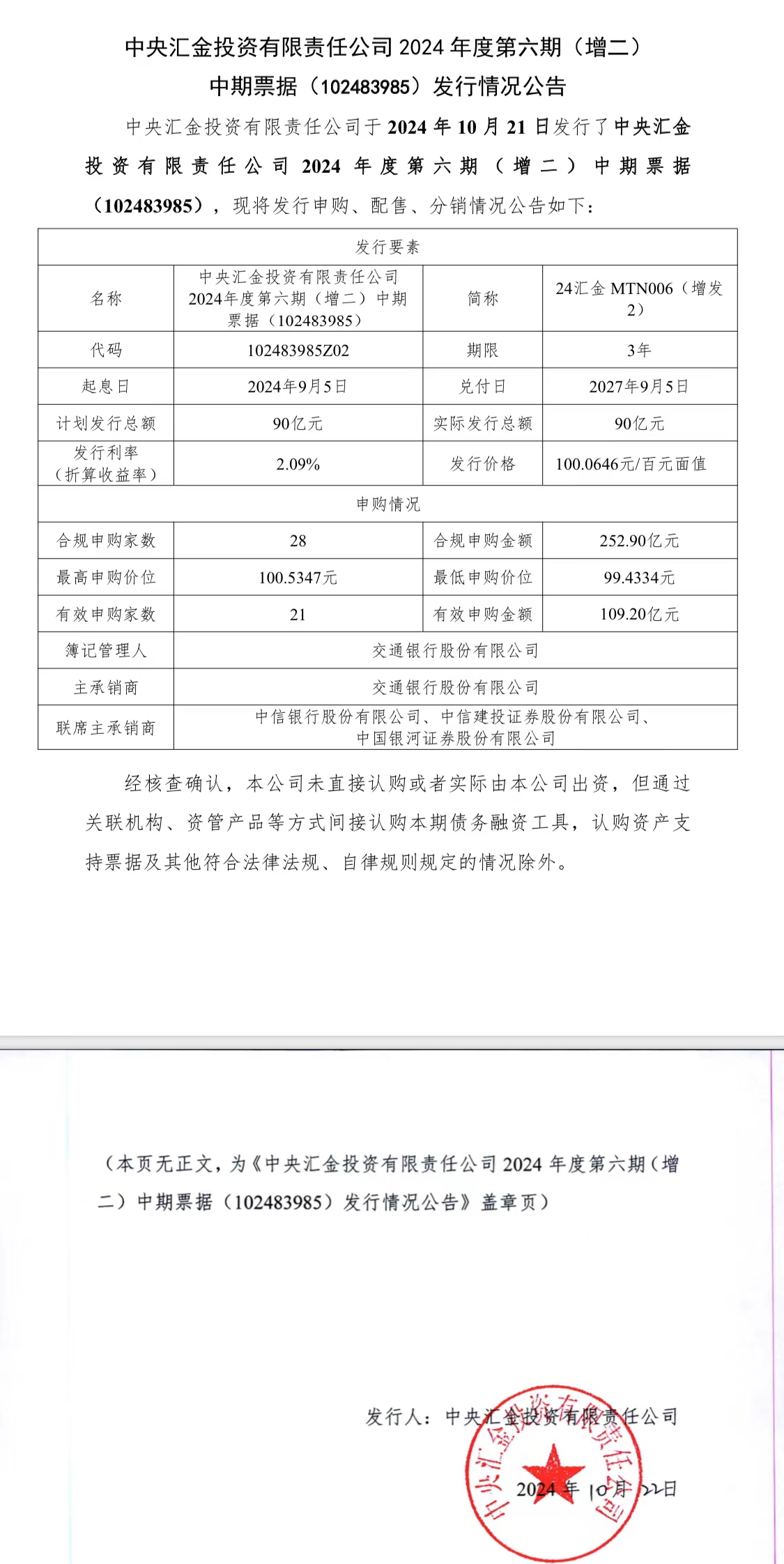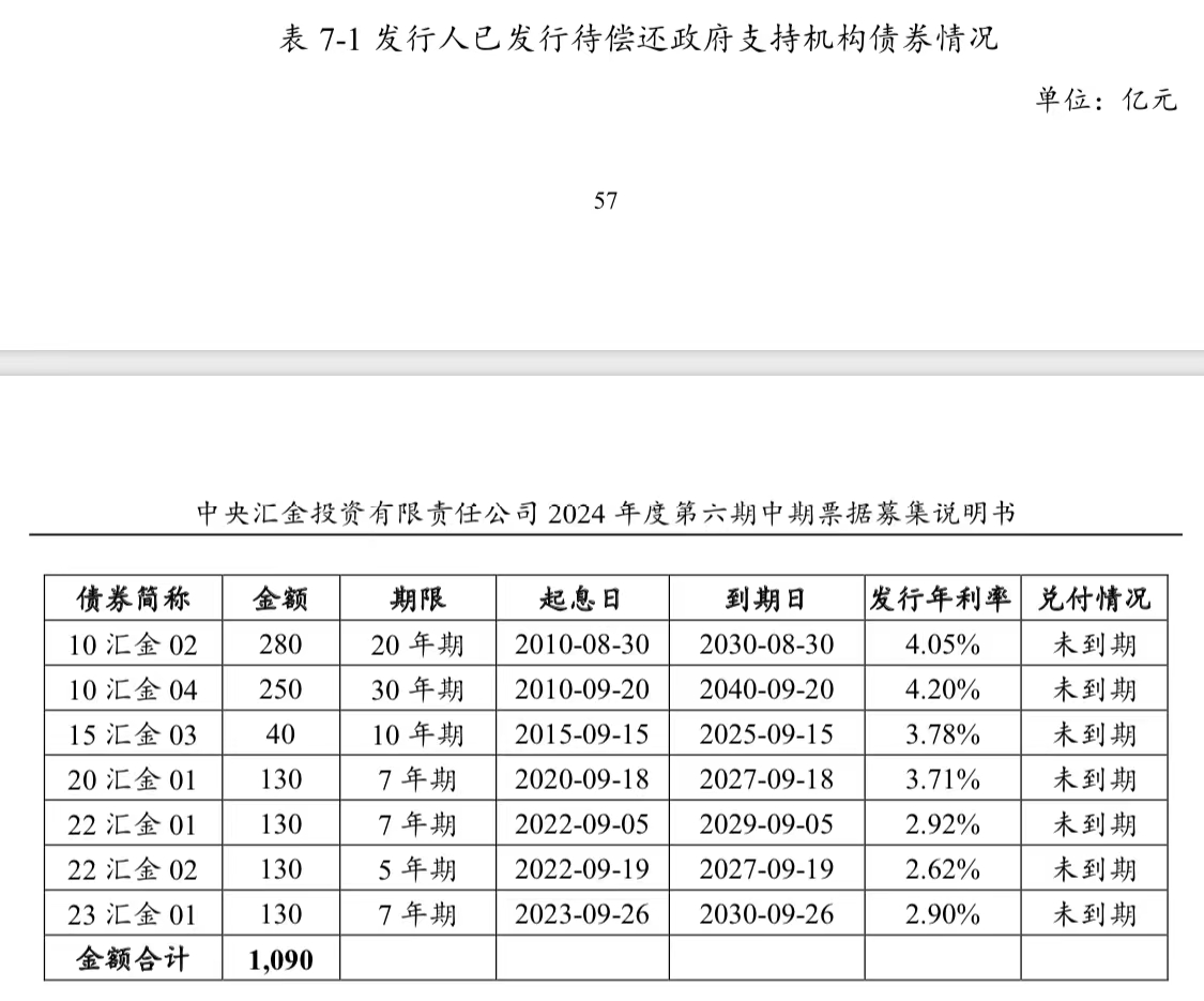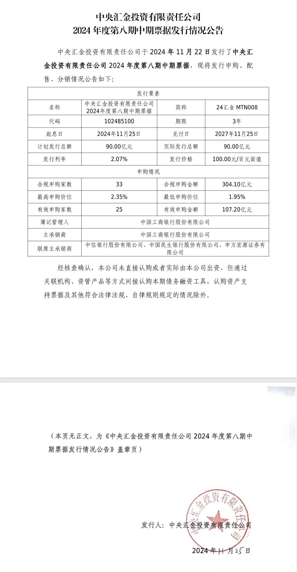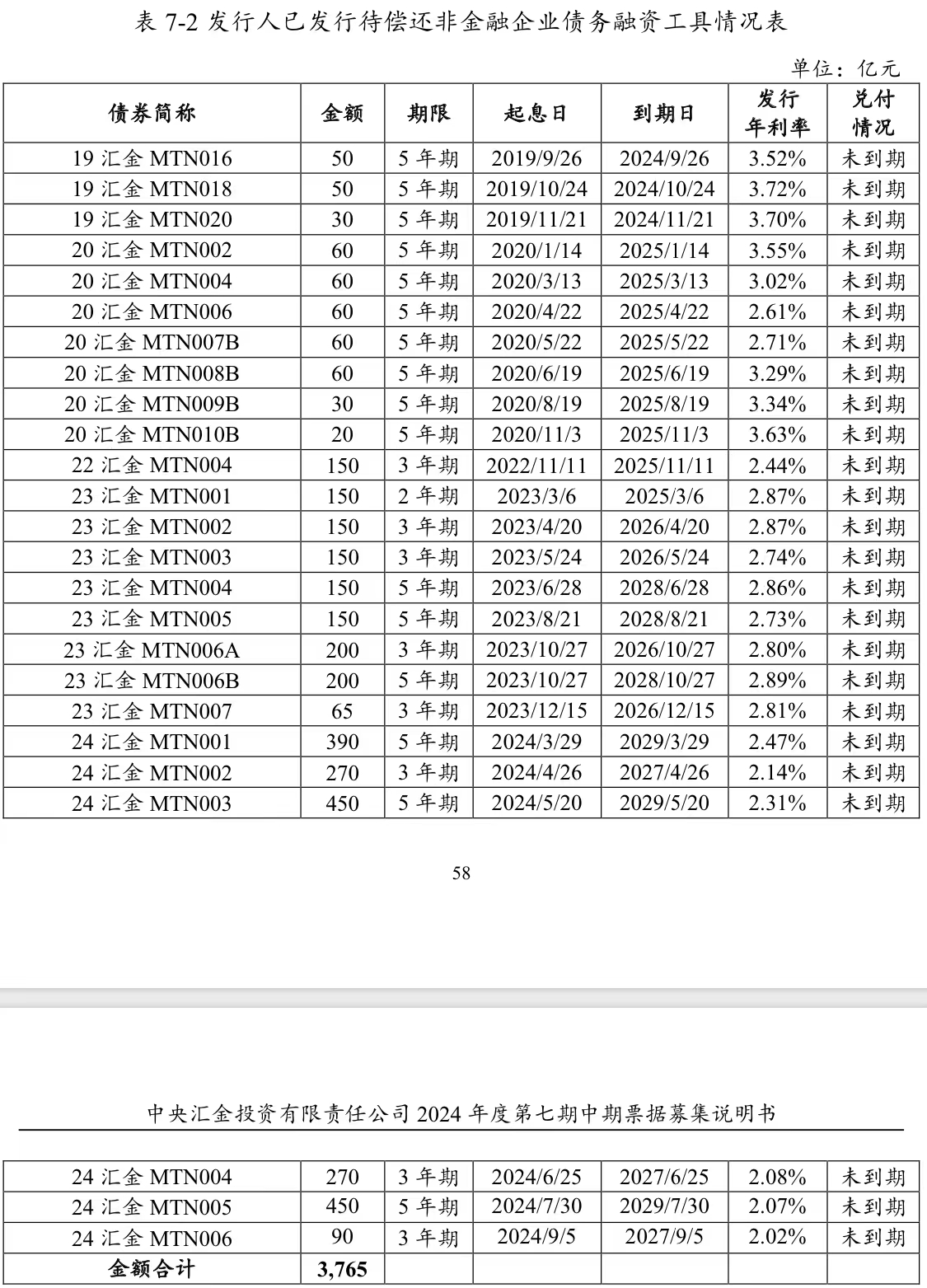 2024年9月4日,中央汇金发行2024年度第六期中期票据,规模90亿元,期限3年;同时发行2024年度第五期(增二)中期票据,规模150亿元,期限5年。今年累计发行1920亿元。130亿元中期票据将于9-11月到期。