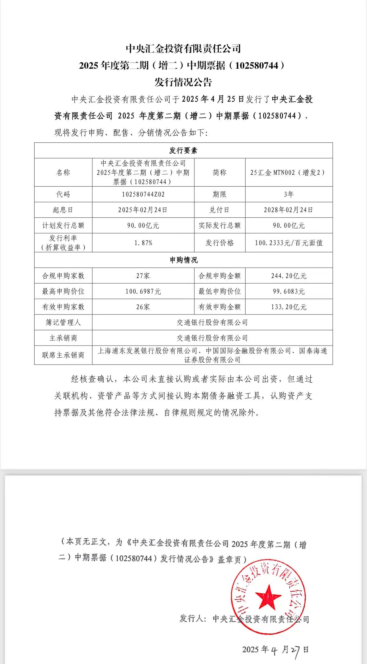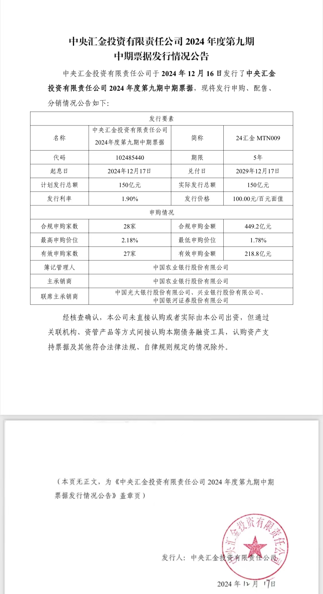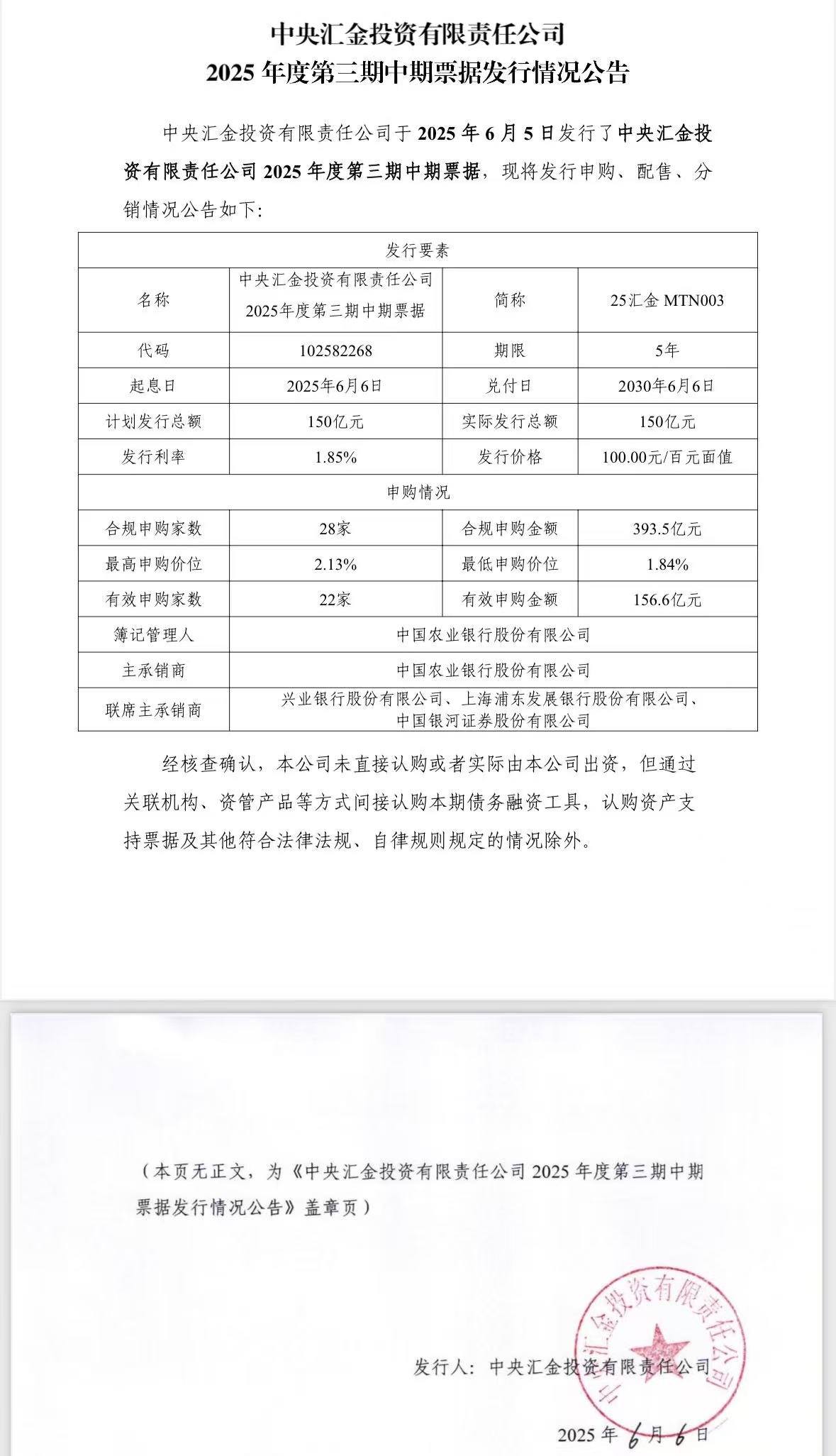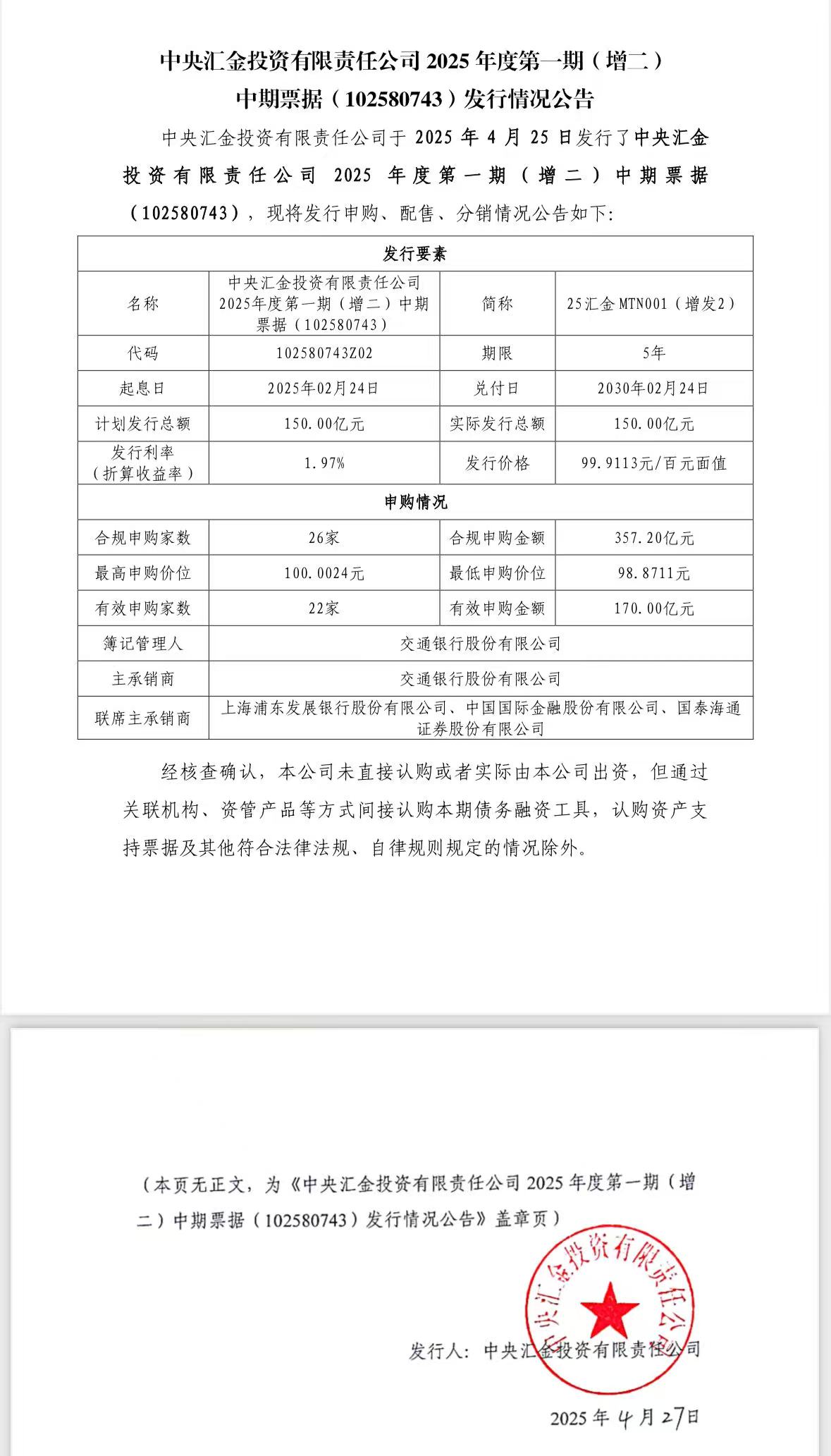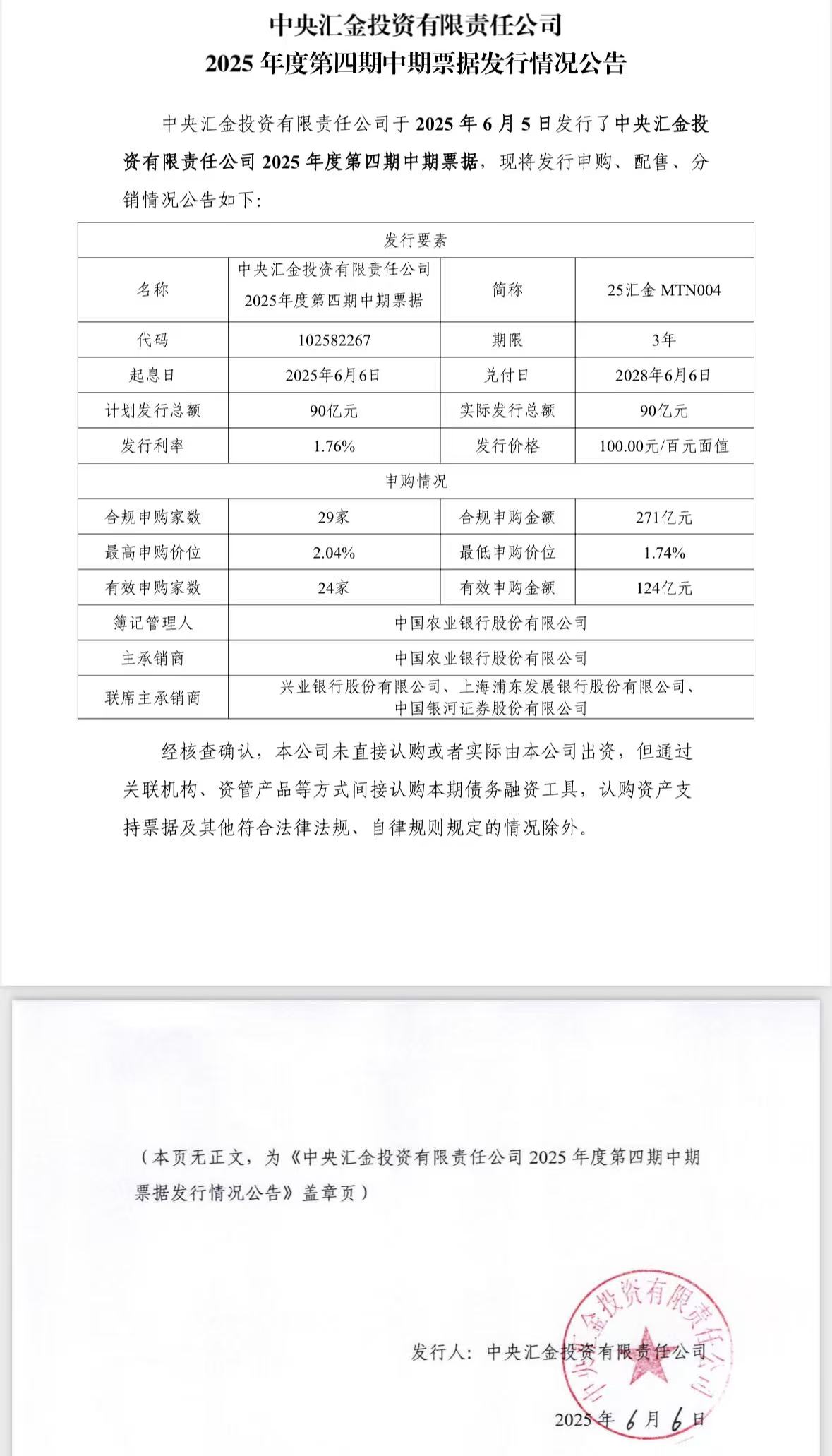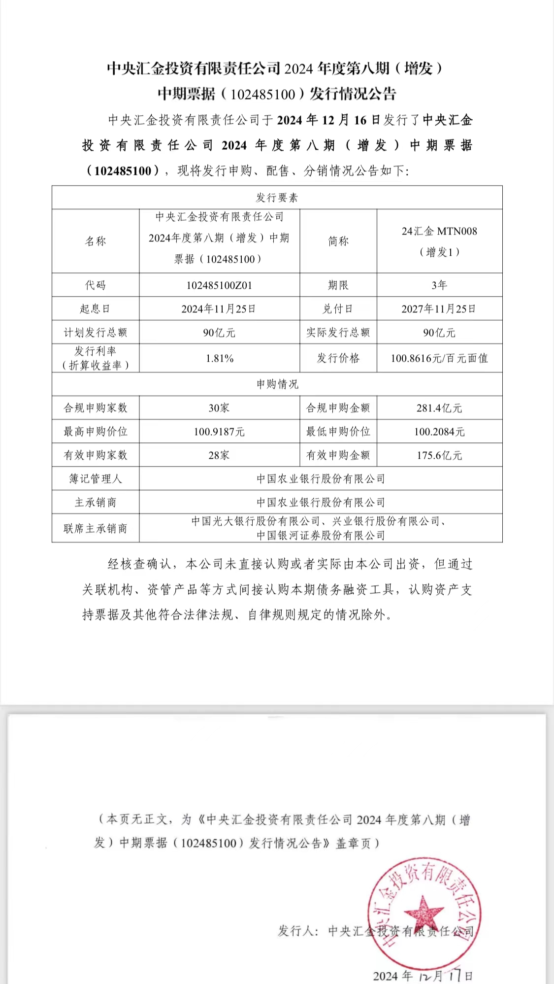 2024年9月4日,中央汇金发行2024年度第六期中期票据,规模90亿元,期限3年;同时发行2024年度第五期(增二)中期票据,规模150亿元,期限5年。今年累计发行1920亿元。130亿元中期票据将于9-11月到期。