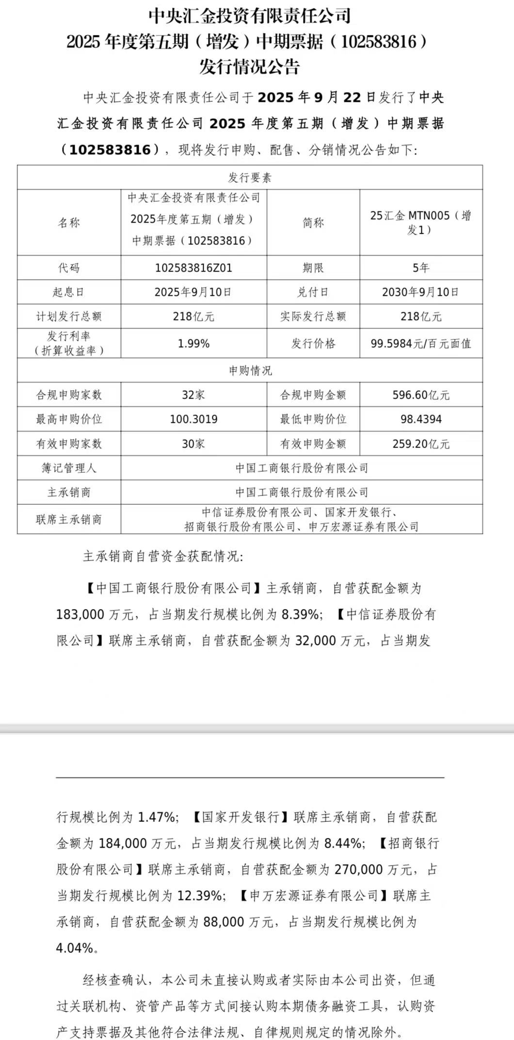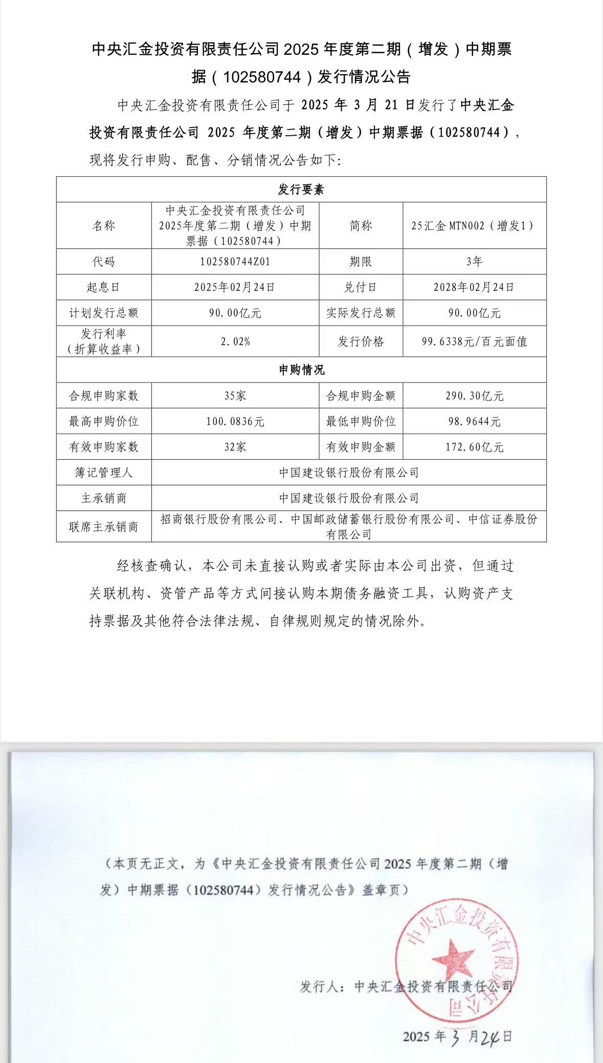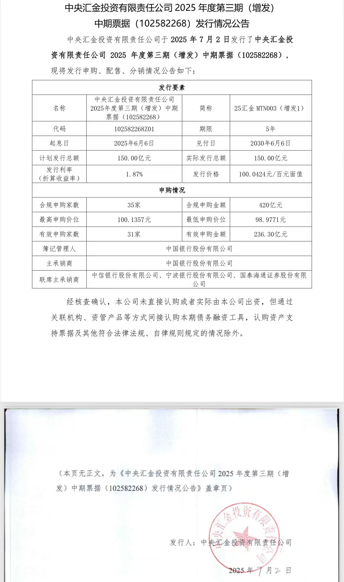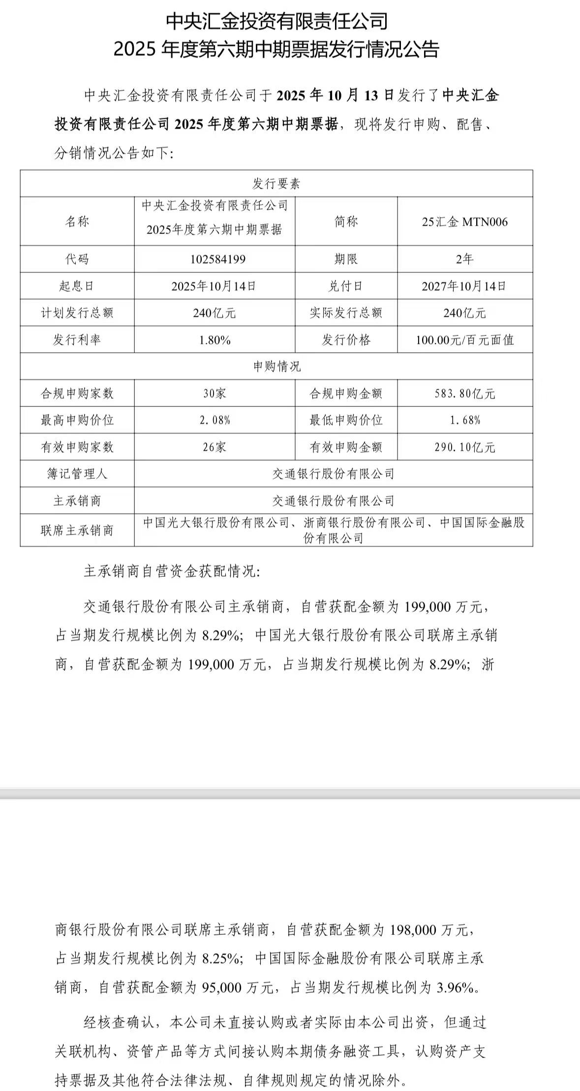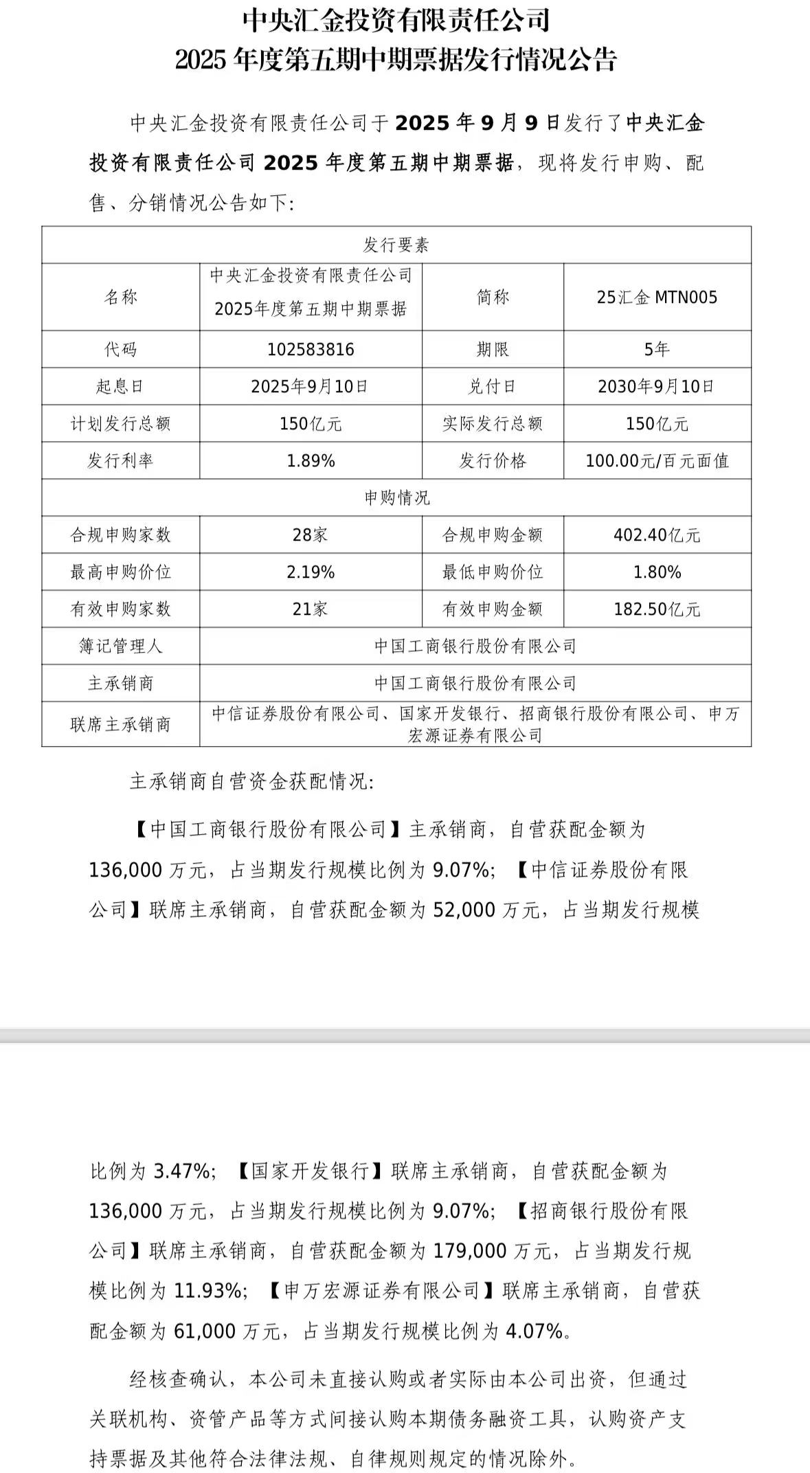 2024年9月4日,中央汇金发行2024年度第六期中期票据,规模90亿元,期限3年;同时发行2024年度第五期(增二)中期票据,规模150亿元,期限5年。今年累计发行1920亿元。130亿元中期票据将于9-11月到期。