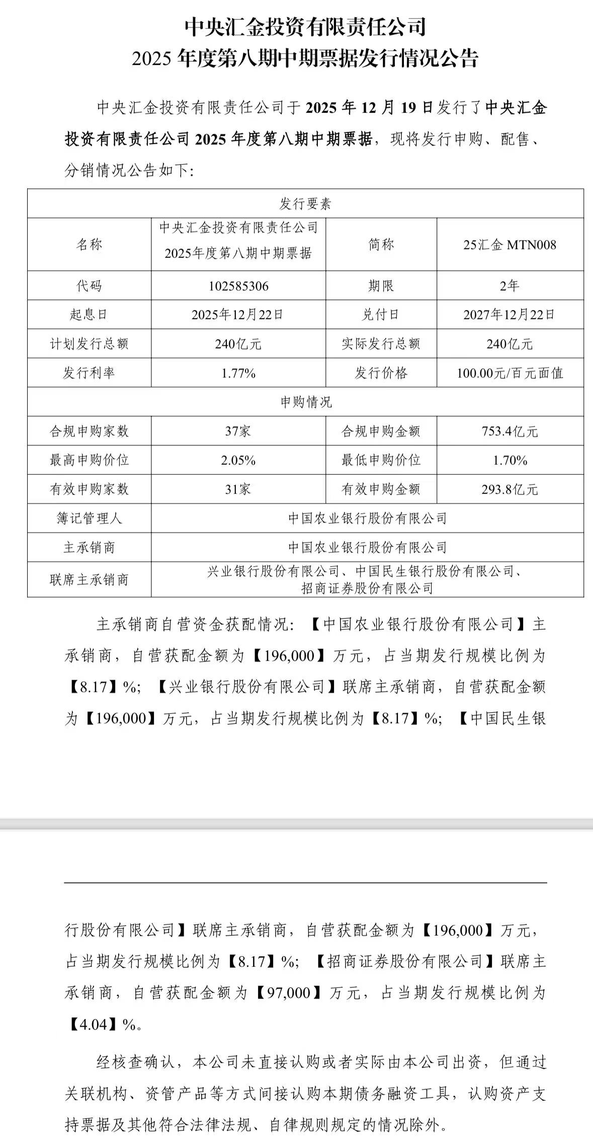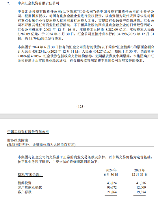 四大行吸收中央汇金存款858.31亿元,较上年末增加209.15亿元。