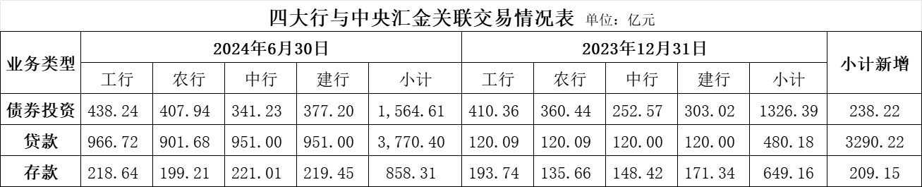四大行对中央汇金贷款3,770.40亿元,较上年末增加3290.22亿元。