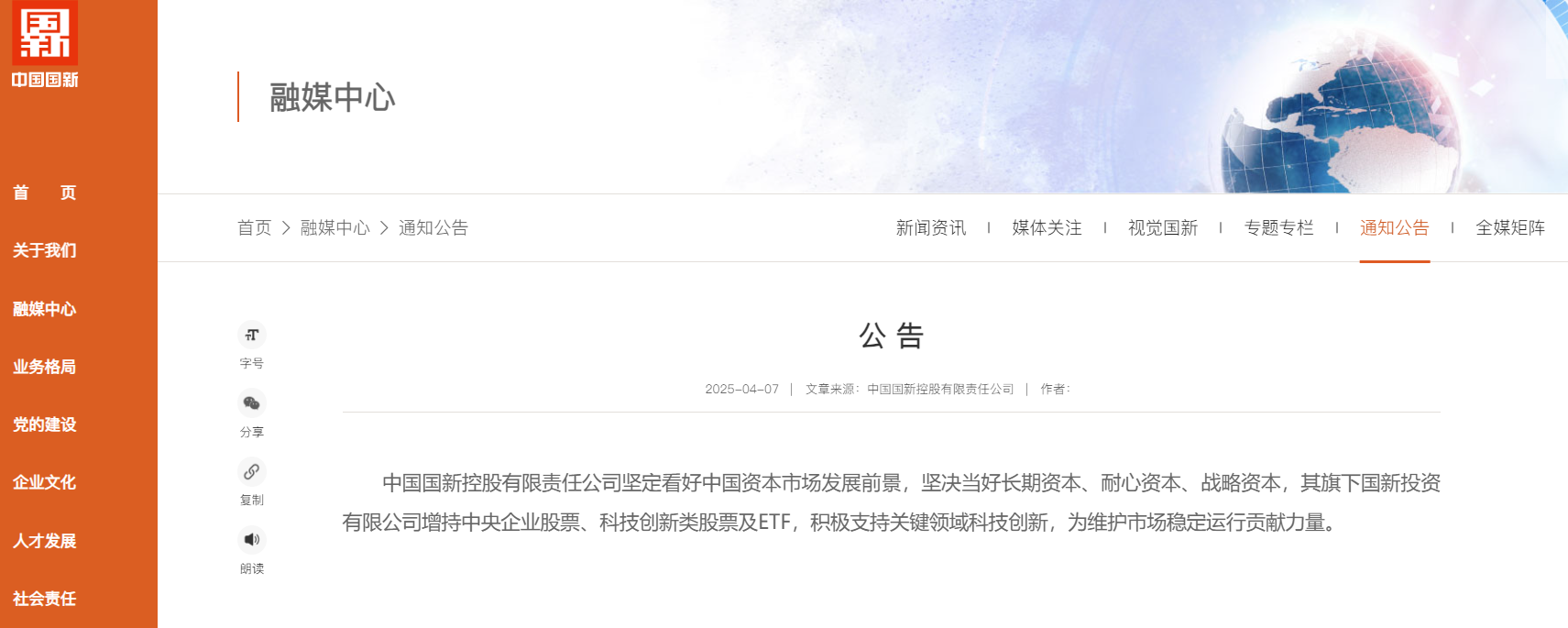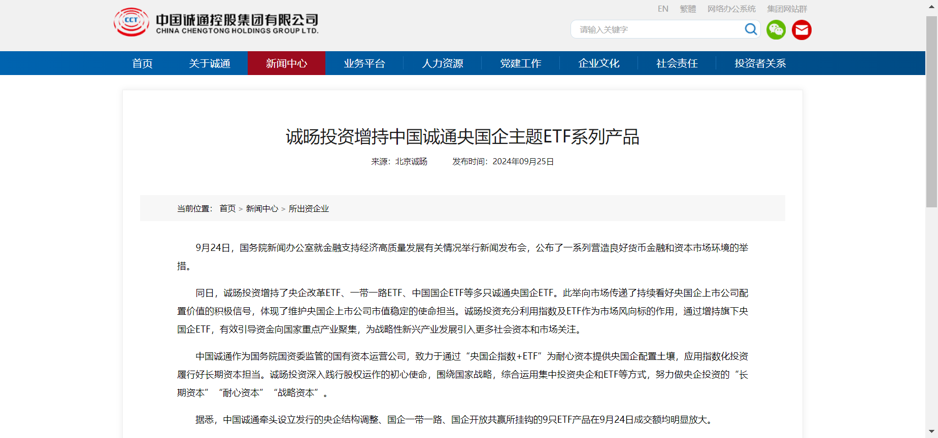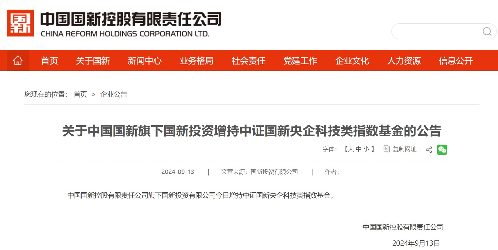 2024年9月13日,《关于中国国新旗下国新投资增持中证国新央企科技类指数基金的公告》发布。