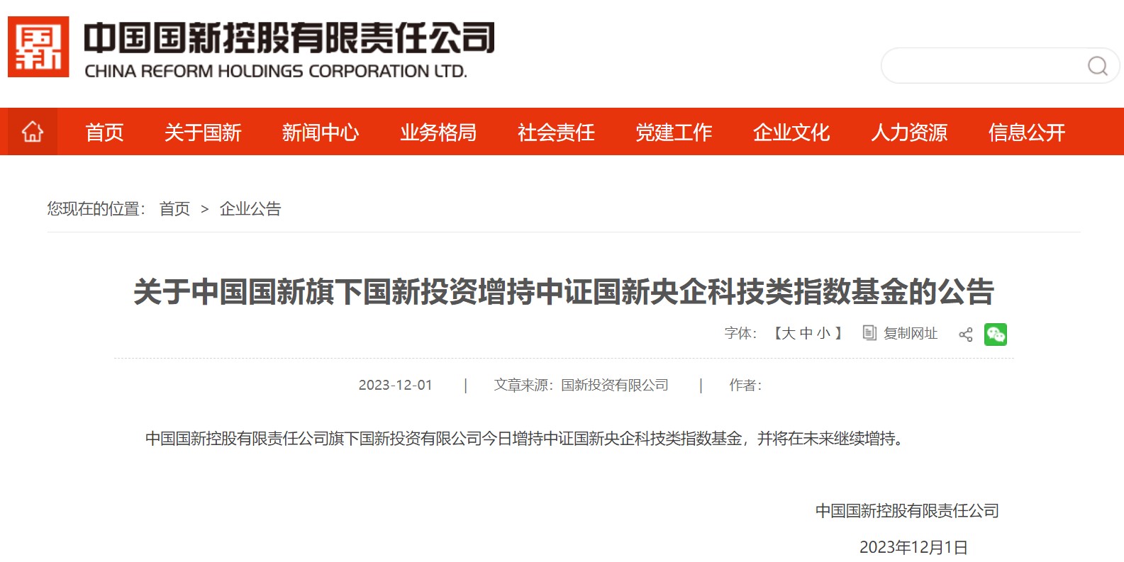 2023年12月1日,《关于中国国新旗下国新投资增持中证国新央企科技类指数基金的公告》发布。