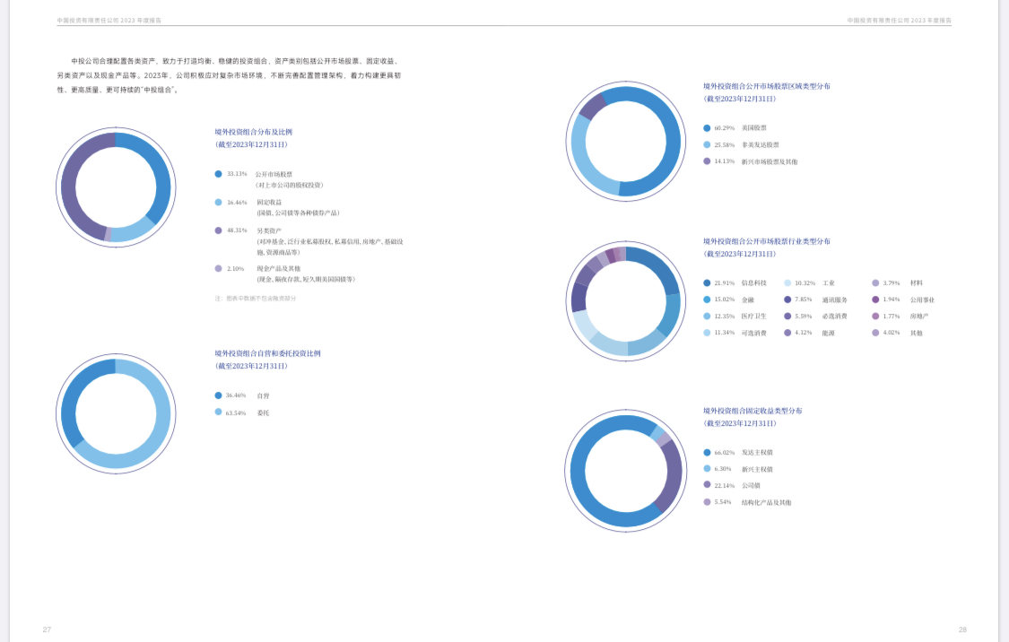 截至2023年底,中投公司总资产达1.33万亿美元,净资产达1.24万亿美元。过去十年累计年化净收益率为6.57%,超越考核基准31个基点,完成十年投资绩效考核目标;自成立以来累计年化净收益率为6.23%(以上业绩均为美元计算)。境外投资组合分布中,公开市场股票、固定收益、另类资产、现金产品及其他分别占比33.13%、16.46%、48.31%和2.10%。