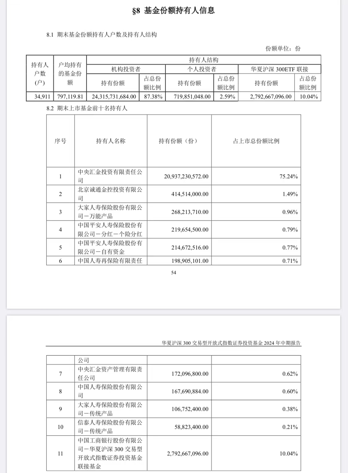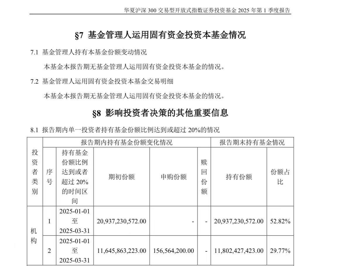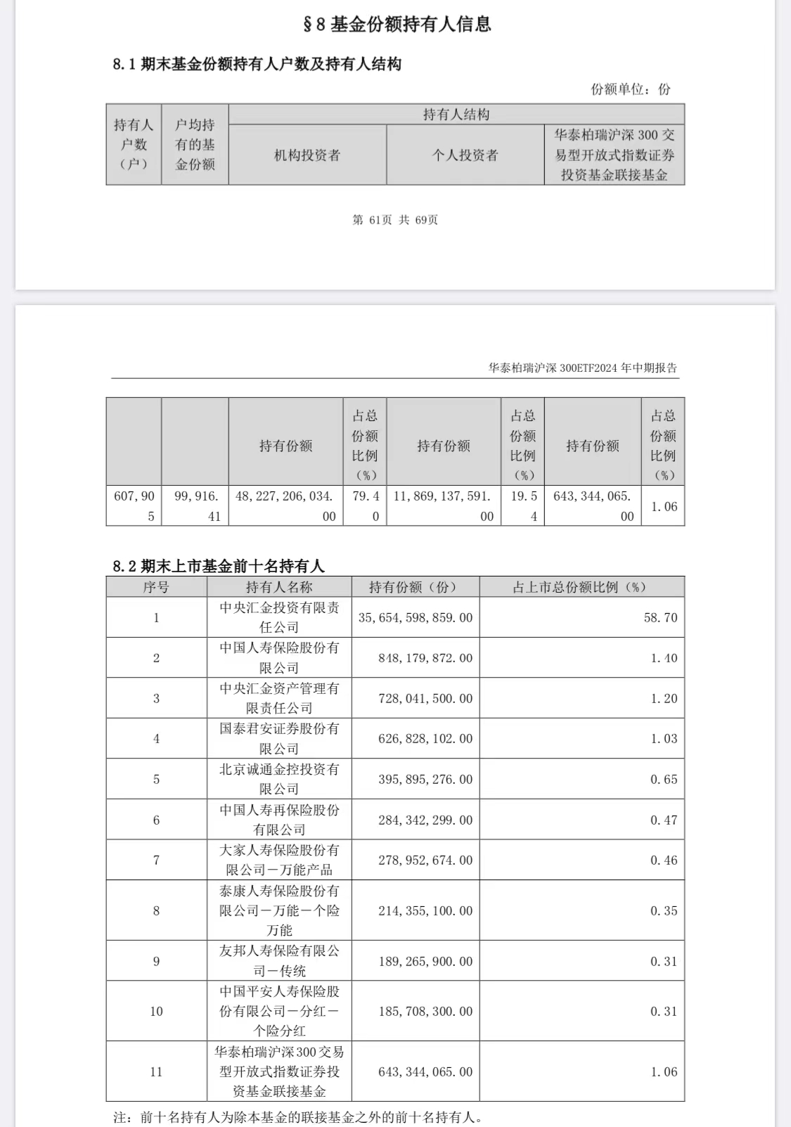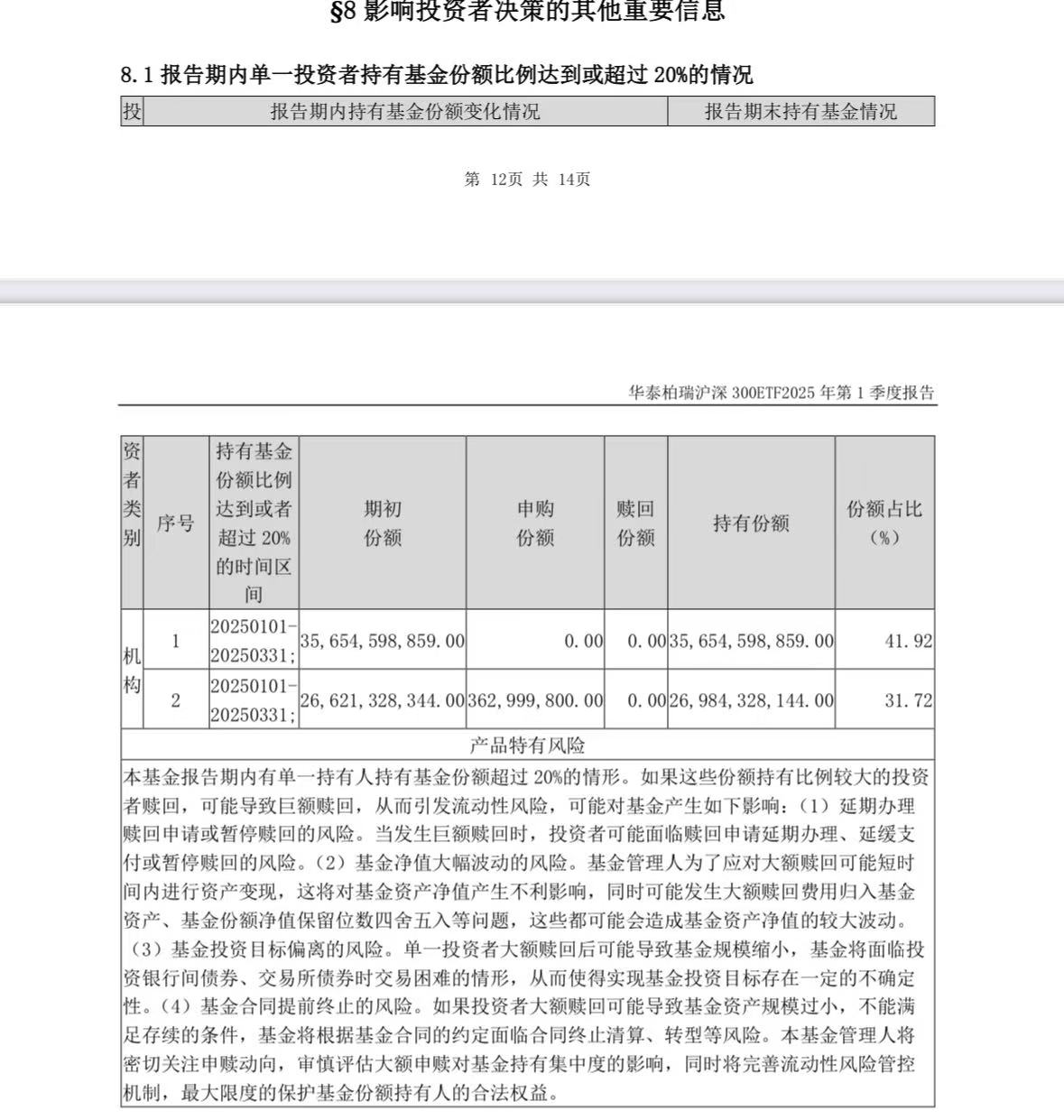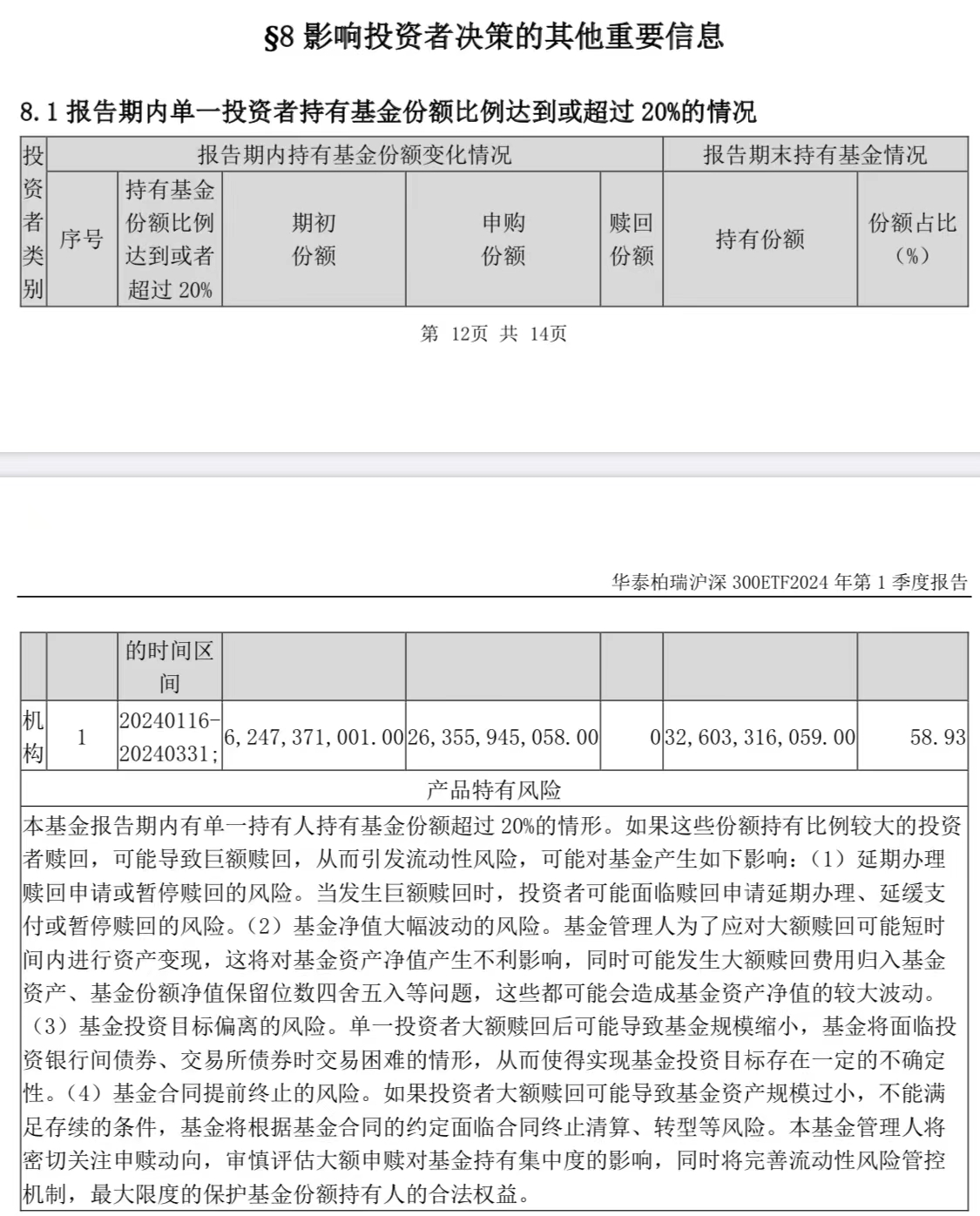 2024年一季度,华泰柏瑞沪深300ETF份额新增178.85亿份,中央汇金申购263.56亿份华泰柏瑞沪深300ETF,其他投资者赎回84.71亿份华泰柏瑞沪深300ETF。