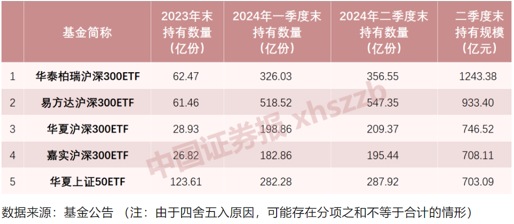 上交所数据显示,境内千亿级宽基ETF已有6只,华泰柏瑞沪深300ETF以3658亿元规模位列第一,易方达沪深300ETF以2389亿元规模位居第二。