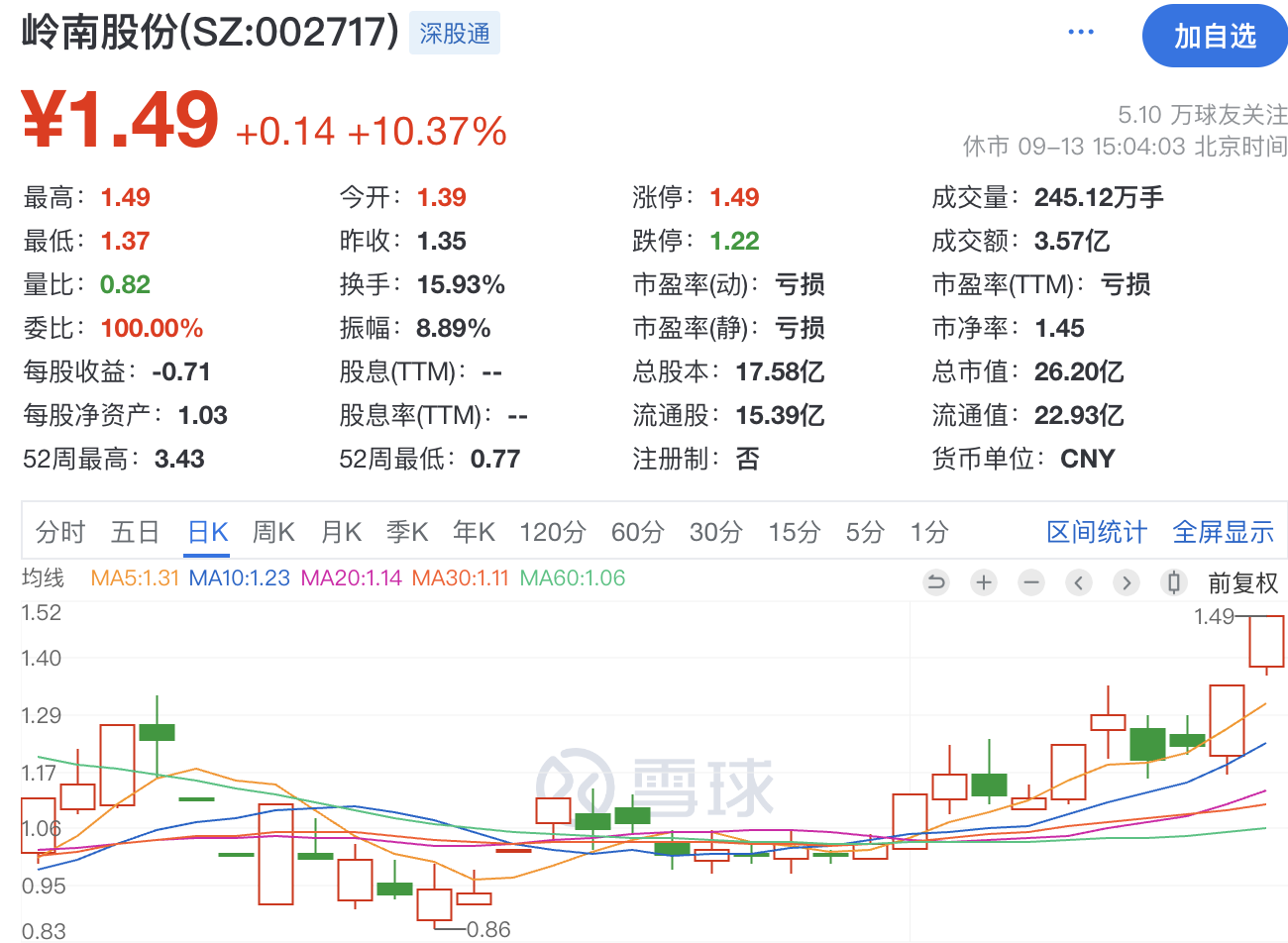自从8月9日转债退市之后,岭南股份的价格从1元涨到1.5元了,这两天更是连续涨停,这是可转债投资人的悲哀时刻。评级调成c,银行贷不了款,任何一家还算正常的公司会接受这种处境?虽然还没退市
