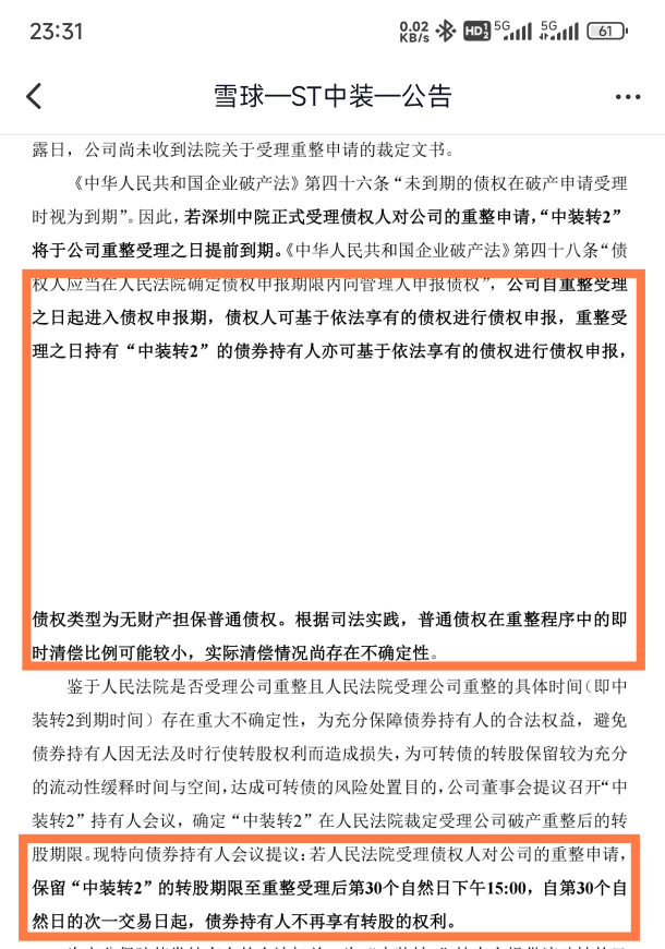 4、所以赌小额刚兑的投资者应该警惕,中装转2如果不下修到底化债,小额刚兑的投资者就必将只有一小部分部分投资者可以全身而退(刚兑估计几千块钱),剩下的都遭受巨大的损失。至于中装转2能否下修到底,要寄托重组方的仁慈,同时也是存在重组不通过的可能性的。所以我认为当前的价格84.592元赌刚兑是是一个亏到爆的投资。