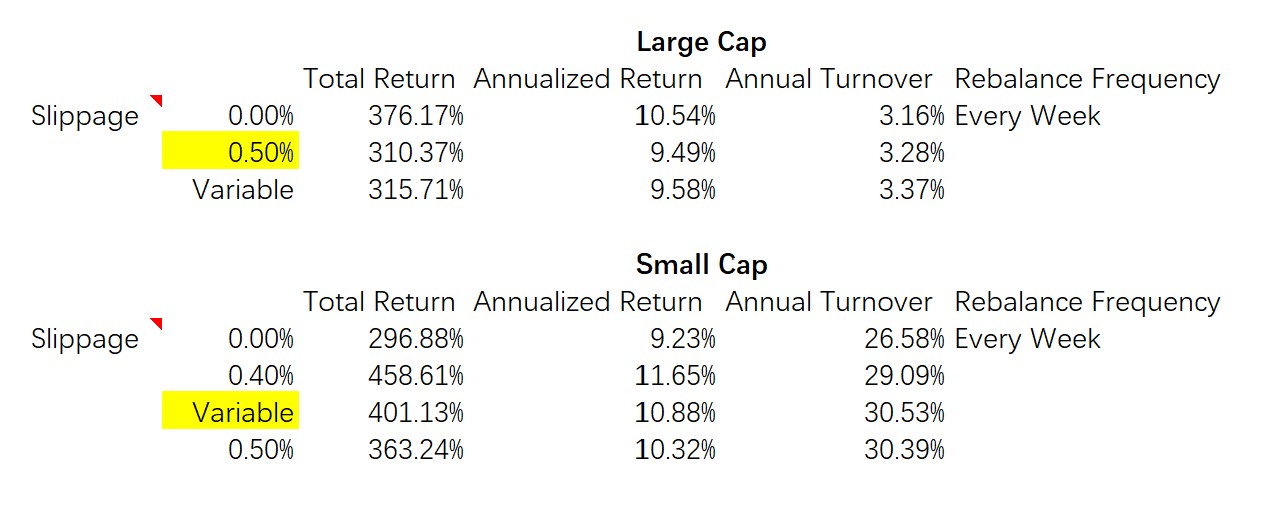 我分别写了两个最简单的大盘和小盘策略,总体上小盘的滑点略高于大盘,但差异也不是很大。