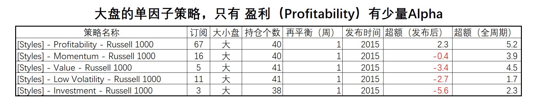 此外,单一因子在美股上几乎很难有Alpha;网站上有人做了5个单因子策略,以Russell 1000为业绩基准;基于我在今年7月20日的统计结果,只有 盈利/质量因子(Profitability)有 2.3%的Alpha,其他全为负。但是,刚刚(9月16日)登录网站又查看了一下这几个策略,忽然发现全都有正Alpha了 —— 我不清楚这是网站的相关因子被重写了,还是设计师的策略有所调整;总之,这样的不稳定性,让人很担心网站上公开的实盘业绩是否靠谱。