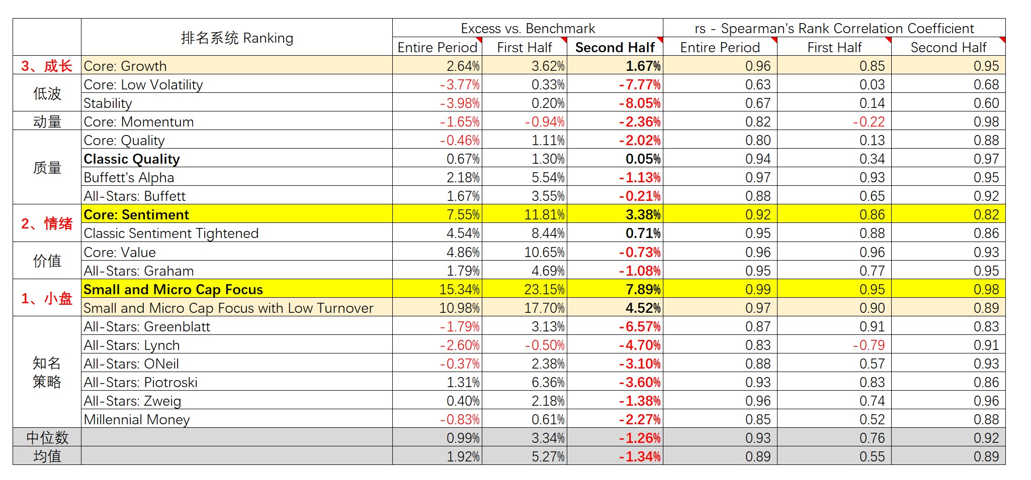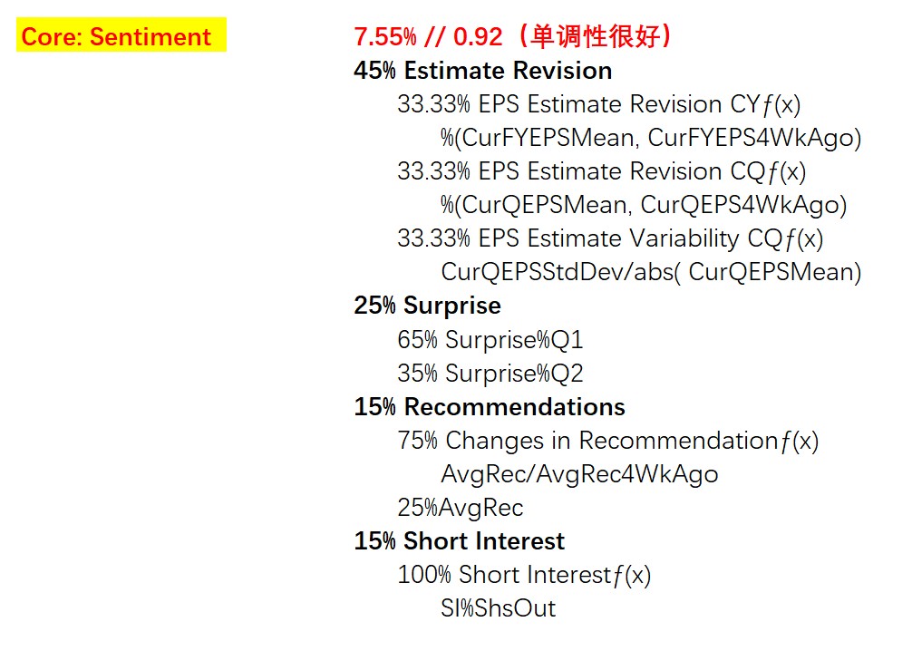 1、Core: Sentiment(情绪)这个是网站提供排名系统,排名单调性很好;国内在情绪方面的研报较少,可以作为参考