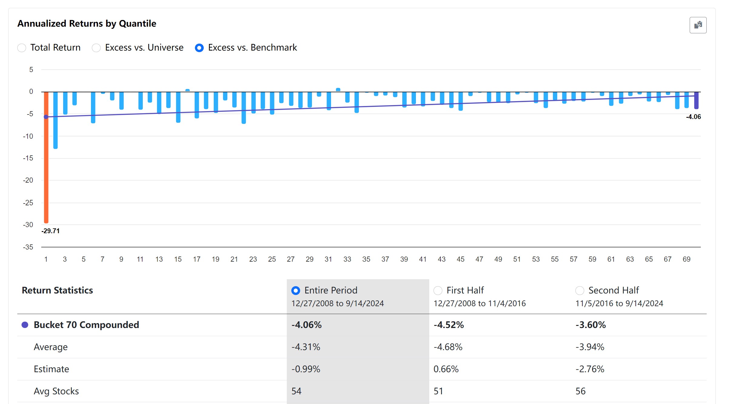 同时,网站也提供了一些自研策略和基于知名投资者的模拟策略,但总体效果同样不佳。具体情况可以参见下图中的“Second Half”列,统计的时间段为2016年10月22日至2024年7月20日,绝大多数的Alpha为负。