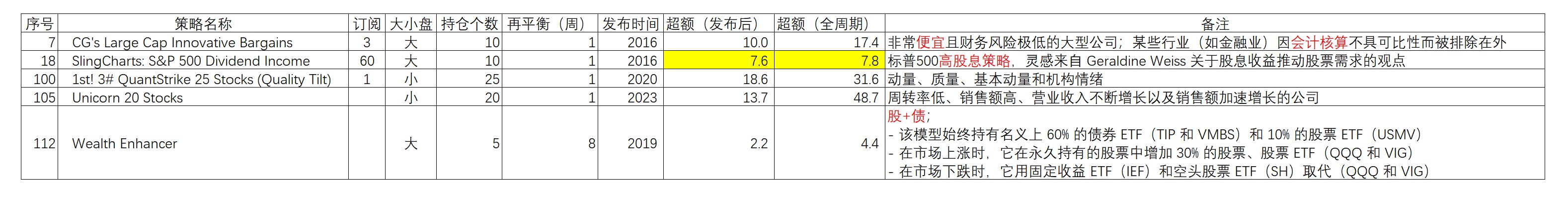 少数订阅/免费策略的实盘业绩较好,设计思路值得借鉴;个人感觉要在美股上做出显著的Alpha,需要有很好的财会知识和能力;详情参见下表: